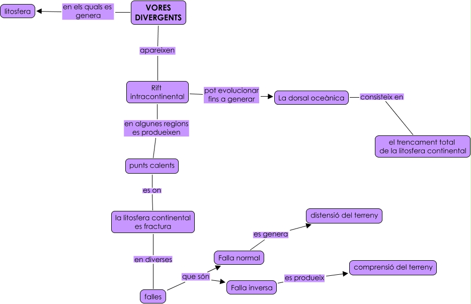 Este Cmap, tiene información relacionada con: vores divergents, La dorsal oceànica consisteix en el trencament total de la litosfera continental, VORES DIVERGENTS en els quals es genera litosfera, Falla inversa es produeix comprensió del terreny, falles que són Falla normal, la litosfera continental es fractura en diverses falles, punts calents es on la litosfera continental es fractura, Rift intracontinental en algunes regions es produeixen punts calents, VORES DIVERGENTS apareixen Rift intracontinental, Rift intracontinental pot evolucionar fins a generar La dorsal oceànica, falles que són Falla inversa, Falla normal es genera distensió del terreny