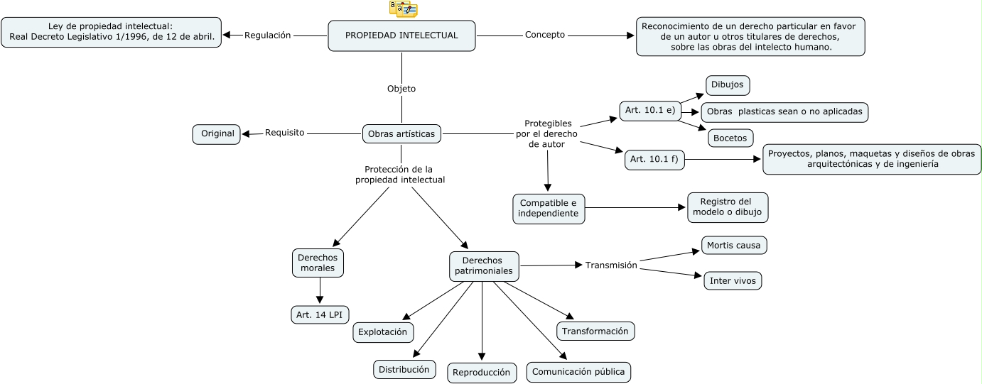 Este Cmap, tiene información relacionada con: Mapa conceptual Propiedad intelectual, PROPIEDAD INTELECTUAL Regulación Ley de propiedad intelectual: Real Decreto Legislativo 1/1996, de 12 de abril., Derechos patrimoniales ???? Transformación, Derechos patrimoniales Transmisión Inter vivos, Obras artísticas Protegibles por el derecho de autor Compatible e independiente, Derechos patrimoniales ???? Reproducción, Obras artísticas Requisito Original, PROPIEDAD INTELECTUAL Objeto Obras artísticas, Compatible e independiente ???? Registro del modelo o dibujo, Derechos patrimoniales ???? Comunicación pública, Derechos patrimoniales Transmisión Mortis causa, Derechos patrimoniales ???? Explotación, Obras artísticas Protegibles por el derecho de autor Art. 10.1 e), Derechos morales ???? Art. 14 LPI, Art. 10.1 f) ???? Proyectos, planos, maquetas y diseños de obras arquitectónicas y de ingeniería, Obras artísticas Protección de la propiedad intelectual Derechos patrimoniales, Derechos patrimoniales ???? Distribución, Obras artísticas Protegibles por el derecho de autor Art. 10.1 f), Art. 10.1 e) ???? Dibujos, Obras artísticas Protección de la propiedad intelectual Derechos morales, PROPIEDAD INTELECTUAL Concepto Reconocimiento de un derecho particular en favor de un autor u otros titulares de derechos, sobre las obras del intelecto humano.