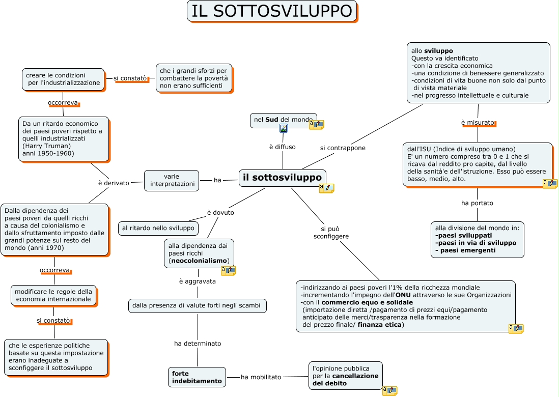 Questa Cmap, creata con IHMC CmapTools, contiene informazioni relative a: 2) Sviluppo e sottosviluppo (cl III AA), il sottosviluppo è dovuto al ritardo nello sviluppo, varie interpretazioni è derivato Da un ritardo economico dei paesi poveri rispetto a quelli industrializzati (Harry Truman) anni 1950-1960), Da un ritardo economico dei paesi poveri rispetto a quelli industrializzati (Harry Truman) anni 1950-1960) occorreva creare le condizioni per l'industrializzazione, allo sviluppo Questo va identificato -con la crescita economica -una condizione di benessere generalizzato -condizioni di vita buone non solo dal punto di vista materiale -nel progresso intellettuale e culturale è misurato dall'ISU (Indice di sviluppo umano) E' un numero compreso tra 0 e 1 che si ricava dal reddito pro capite, dal livello della sanità'e dell'istruzione. Esso può essere basso, medio, alto., dall'ISU (Indice di sviluppo umano) E' un numero compreso tra 0 e 1 che si ricava dal reddito pro capite, dal livello della sanità'e dell'istruzione. Esso può essere basso, medio, alto. ha portato alla divisione del mondo in: -paesi sviluppati -paesi in via di sviluppo - paesi emergenti, varie interpretazioni è derivato Dalla dipendenza dei paesi poveri da quelli ricchi a causa del colonialismo e dallo sfruttamento imposto dalle grandi potenze sul resto del mondo (anni 1970), il sottosviluppo si contrappone allo sviluppo Questo va identificato -con la crescita economica -una condizione di benessere generalizzato -condizioni di vita buone non solo dal punto di vista materiale -nel progresso intellettuale e culturale, dalla presenza di valute forti negli scambi ha determinato forte indebitamento, modificare le regole della economia internazionale si constatò che le esperienze politiche basate su questa impostazione erano inadeguate a sconfiggere il sottosviluppo, Dalla dipendenza dei paesi poveri da quelli ricchi a causa del colonialismo e dallo sfruttamento imposto dalle grandi potenze sul resto del mondo (anni 1970) occorreva modificare le regole della economia internazionale, il sottosviluppo ha varie interpretazioni, forte indebitamento ha mobilitato l'opinione pubblica per la cancellazione del debito, il sottosviluppo si può sconfiggere -indirizzando ai paesi poveri l'1% della ricchezza mondiale -incrementando l'impegno dell'ONU attraverso le sue Organizzazioni -con il commercio equo e solidale (importazione diretta /pagamento di prezzi equi/pagamento anticipato delle merci/trasparenza nella formazione del prezzo finale/ finanza etica), creare le condizioni per l'industrializzazione si constatò che i grandi sforzi per combattere la povertà non erano sufficienti, il sottosviluppo è diffuso nel Sud del mondo, il sottosviluppo è dovuto alla dipendenza dai paesi ricchi (neocolonialismo), alla dipendenza dai paesi ricchi (neocolonialismo) è aggravata dalla presenza di valute forti negli scambi