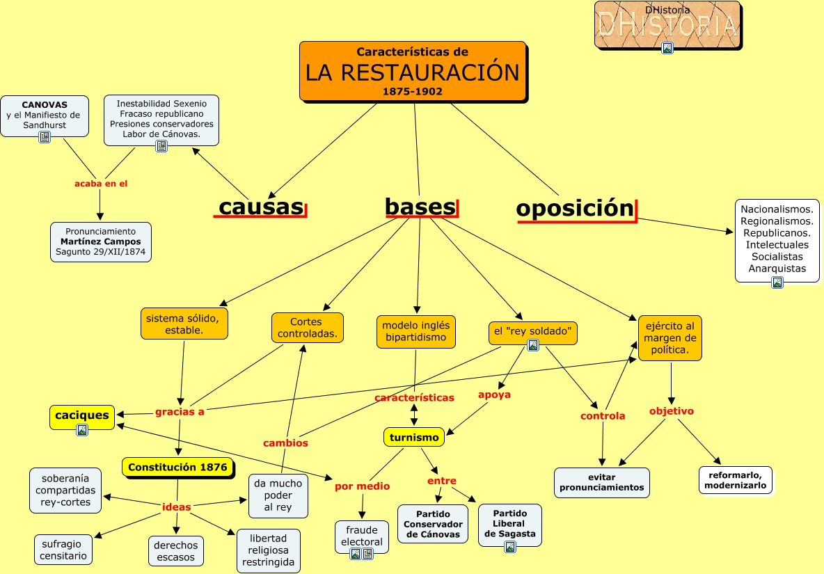 Este Cmap, tiene información relacionada con: Características Restauración, Constitución 1876 ideas soberanía compartidas rey-cortes, Constitución 1876 ideas da mucho poder al rey, ejército al margen de política. objetivo reformarlo, modernizarlo, sistema sólido, estable. gracias a ejército al margen de política., da mucho poder al rey cambios Cortes controladas., Características de LA RESTAURACIÓN 1875-1902 bases el "rey soldado", Características de LA RESTAURACIÓN 1875-1902 oposición Nacionalismos. Regionalismos. Republicanos. Intelectuales Socialistas Anarquistas, turnismo entre Partido Conservador de Cánovas, Inestabilidad Sexenio Fracaso republicano Presiones conservadores Labor de Cánovas. acaba en el CANOVAS y el Manifiesto de Sandhurst, Características de LA RESTAURACIÓN 1875-1902 bases modelo inglés bipartidismo, Características de LA RESTAURACIÓN 1875-1902 bases Cortes controladas., turnismo por medio caciques, ejército al margen de política. objetivo evitar pronunciamientos, el "rey soldado" apoya turnismo, Características de LA RESTAURACIÓN 1875-1902 causas Inestabilidad Sexenio Fracaso republicano Presiones conservadores Labor de Cánovas., Constitución 1876 ideas sufragio censitario, da mucho poder al rey cambios el "rey soldado", sistema sólido, estable. gracias a caciques, Características de LA RESTAURACIÓN 1875-1902 bases sistema sólido, estable., el "rey soldado" controla ejército al margen de política.