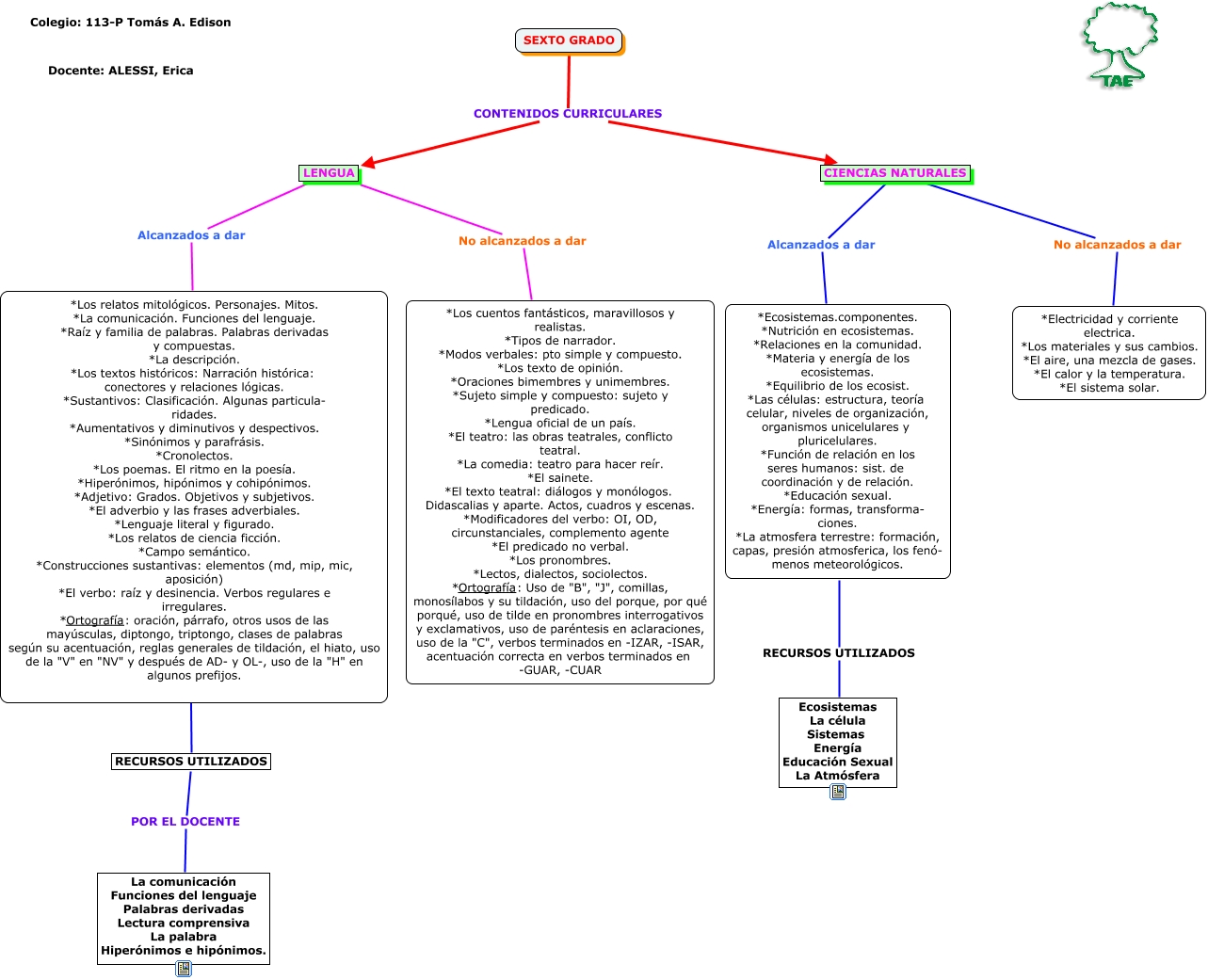 Este Cmap, tiene información relacionada con: Contenidos 6º 2010, LENGUA No alcanzados a dar *Los cuentos fantásticos, maravillosos y realistas. *Tipos de narrador. *Modos verbales: pto simple y compuesto. *Los texto de opinión. *Oraciones bimembres y unimembres. *Sujeto simple y compuesto: sujeto y predicado. *Lengua oficial de un país. *El teatro: las obras teatrales, conflicto teatral. *La comedia: teatro para hacer reír. *El sainete. *El texto teatral: diálogos y monólogos. Didascalias y aparte. Actos, cuadros y escenas. *Modificadores del verbo: OI, OD, circunstanciales, complemento agente *El predicado no verbal. *Los pronombres. *Lectos, dialectos, sociolectos. *Ortografía: Uso de "B", "J", comillas, monosílabos y su tildación, uso del porque, por qué porqué, uso de tilde en pronombres interrogativos y exclamativos, uso de paréntesis en aclaraciones, uso de la "C", verbos terminados en -IZAR, -ISAR, acentuación correcta en verbos terminados en -GUAR, -CUAR, *Los relatos mitológicos. Personajes. Mitos. *La comunicación. Funciones del lenguaje. *Raíz y familia de palabras. Palabras derivadas y compuestas. *La descripción. *Los textos históricos: Narración histórica: conectores y relaciones lógicas. *Sustantivos: Clasificación. Algunas particula- ridades. *Aumentativos y diminutivos y despectivos. *Sinónimos y parafrásis. *Cronolectos. *Los poemas. El ritmo en la poesía. *Hiperónimos, hipónimos y cohipónimos. *Adjetivo: Grados. Objetivos y subjetivos. *El adverbio y las frases adverbiales. *Lenguaje literal y figurado. *Los relatos de ciencia ficción. *Campo semántico. *Construcciones sustantivas: elementos (md, mip, mic, aposición) *El verbo: raíz y desinencia. Verbos regulares e irregulares. *Ortografía: oración, párrafo, otros usos de las mayúsculas, diptongo, triptongo, clases de palabras según su acentuación, reglas generales de tildación, el hiato, uso de la "V" en "NV" y después de AD- y OL-, uso de la "H" en algunos prefijos. ???? RECURSOS UTILIZADOS, CIENCIAS NATURALES No alcanzados a dar *Electricidad y corriente electrica. *Los materiales y sus cambios. *El aire, una mezcla de gases. *El calor y la temperatura. *El sistema solar., SEXTO GRADO CONTENIDOS CURRICULARES LENGUA, LENGUA Alcanzados a dar *Los relatos mitológicos. Personajes. Mitos. *La comunicación. Funciones del lenguaje. *Raíz y familia de palabras. Palabras derivadas y compuestas. *La descripción. *Los textos históricos: Narración histórica: conectores y relaciones lógicas. *Sustantivos: Clasificación. Algunas particula- ridades. *Aumentativos y diminutivos y despectivos. *Sinónimos y parafrásis. *Cronolectos. *Los poemas. El ritmo en la poesía. *Hiperónimos, hipónimos y cohipónimos. *Adjetivo: Grados. Objetivos y subjetivos. *El adverbio y las frases adverbiales. *Lenguaje literal y figurado. *Los relatos de ciencia ficción. *Campo semántico. *Construcciones sustantivas: elementos (md, mip, mic, aposición) *El verbo: raíz y desinencia. Verbos regulares e irregulares. *Ortografía: oración, párrafo, otros usos de las mayúsculas, diptongo, triptongo, clases de palabras según su acentuación, reglas generales de tildación, el hiato, uso de la "V" en "NV" y después de AD- y OL-, uso de la "H" en algunos prefijos., SEXTO GRADO CONTENIDOS CURRICULARES CIENCIAS NATURALES, RECURSOS UTILIZADOS POR EL DOCENTE La comunicación Funciones del lenguaje Palabras derivadas Lectura comprensiva La palabra Hiperónimos e hipónimos., CIENCIAS NATURALES Alcanzados a dar *Ecosistemas.componentes. *Nutrición en ecosistemas. *Relaciones en la comunidad. *Materia y energía de los ecosistemas. *Equilibrio de los ecosist. *Las células: estructura, teoría celular, niveles de organización, organismos unicelulares y pluricelulares. *Función de relación en los seres humanos: sist. de coordinación y de relación. *Educación sexual. *Energía: formas, transforma- ciones. *La atmosfera terrestre: formación, capas, presión atmosferica, los fenó- menos meteorológicos., *Ecosistemas.componentes. *Nutrición en ecosistemas. *Relaciones en la comunidad. *Materia y energía de los ecosistemas. *Equilibrio de los ecosist. *Las células: estructura, teoría celular, niveles de organización, organismos unicelulares y pluricelulares. *Función de relación en los seres humanos: sist. de coordinación y de relación. *Educación sexual. *Energía: formas, transforma- ciones. *La atmosfera terrestre: formación, capas, presión atmosferica, los fenó- menos meteorológicos. RECURSOS UTILIZADOS Ecosistemas La célula Sistemas Energía Educación Sexual La Atmósfera
