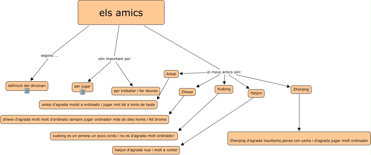 Aquest mapa conceptual conté informació relacionada amb: amics, els amics el meus amics són: Zhenjing, els amics són important per per jugar, Zhenjing ???? Zhenjing d'agrada insultanto,perea con usma i d'agrada jugar molt ordinador, els amics el meus amics són: Haijun, Ankai ???? ankai d'agrada molot a ordinado i jugar mol bé a tenis de taula, Xudong ???? xudong es un persna un poco cordo i no es d'agrada molt ordinador, els amics segons ... definició del dicionari, Zhiwei ???? zhiwei d'agrada molt molt d'ordinato sempre jugar ordinador más de dies hores i fet broma, Haijun ???? haijun d'agrada nua i molt a contel, els amics el meus amics són: Xudong, els amics són important per per treballar i fer deures, els amics el meus amics són: Zhiwei, els amics el meus amics són: Ankai