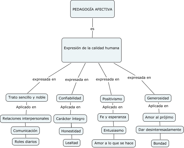 Este Cmap, tiene información relacionada con: PedagogiAfectiva, Expresión de la calidad humana expresada en Trato sencillo y noble, Positivismo Aplicado en Fe y esperanza, Relaciones interpersonales ???? Comunicación, Carácter íntegro ???? Honestidad, Dar desinteresadamente ???? Bondad, Comunicación ???? Roles diarios, Confiabilidad Aplicada en Carácter íntegro, Expresión de la calidad humana expresada en Positivismo, Generosidad Aplicada en Amor al prójimo, Trato sencillo y noble Aplicado en Relaciones interpersonales, Expresión de la calidad humana expresada en Generosidad, Expresión de la calidad humana expresada en Confiabilidad, Carácter íntegro ???? Lealtad, Fe y esperanza ???? Entusiasmo, Amor al prójimo ???? Dar desinteresadamente, Entusiasmo ???? Amor a lo que se hace, PEDAGOGÍA AFECTIVA es Expresión de la calidad humana