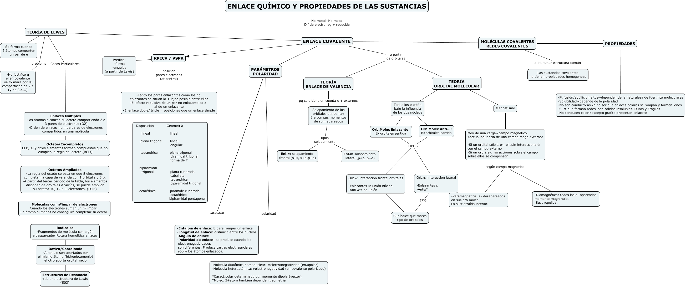 Este Cmap, tiene información relacionada con: Enlace Covalente Núria Mallofré, ENLACE COVALENTE a partir de orbitales TEORÍA ORBITAL MOLECULAR, ENLACE COVALENTE a partir de orbitales TEORÍA ENLACE DE VALENCIA, ENLACE COVALENTE ???? TEORÍA DE LEWIS, TEORÍA ORBITAL MOLECULAR ???? Magnetismo, Radicales -Fragmentos de molécula con algún e despareado/ Rotura homolítica enlaces Dativo/Coordinado -Ambos e son aportados por el mismo átomo (hidronio,amonio) el otro aporta orbital vacío, ENLACE QUÍMICO Y PROPIEDADES DE LAS SUSTANCIAS No metal+No metal Dif de electroneg + reducida ENLACE COVALENTE, PARÁMETROS POLARIDAD polaridad -Molécula diatómica homonuclear: =electronegatividad (en.apolar) -Molécula heteroatómica:≠electronegatividad (en.covalente polarizado) *Caract.polar determinado por momento dipolar(vector) *Molec. 3+atom tambien dependen geometría, Octetos Incompletos El B, Al y otros elementos forman compuestos que no cumplen la regla del octeto (BCl3) Octetos Ampliados -La regla del octeto se basa en que 8 electrones completan la capa de valencia con 1 orbital s y 3 p. -A partir del tercer período de la tabla, los elementos disponen de orbitales d vacíos, se puede ampliar su octeto: 10, 12 o + electrones. (PCl5), ENLACE COVALENTE ???? MOLÉCULAS COVALENTES REDES COVALENTES, Solapamiento de los orbitales donde hay 2 e con sus momentos de spin apareados tipos solapamiento Enl.π: solapamiento lateral (p+p, p+d), Orb.Molec Enlazante: E<orbitales partida TIPOS Orb.π: interacción lateral -Enlazantes π -Antiπ*, Orb.Molec Anti...: E>orbitales partida TIPOS Orb σ: interacción frontal orbitales -Enlazantes σ: unión núcleo -Anti σ*: no unión, -Tanto los pares enlazantes como los no enlazantes se situan lo + lejos posible entre ellos -El efecto repulsivo de un par no enlazante es > al de un enlazante -El enlace doble/ triple = posiciones que un enlace simple ???? Disposición -- Geometría lineal lineal plana trigonal lineal angular tetraédrica plana trigonal piramidal trigonal forma de T bipiramidal trigonal plana cuadrada caballete tetraédrica bipiramidal trigonal octaédrica piramide cuadrada octaédrica bipiramidal pentagonal, PARÁMETROS POLARIDAD carac.cte -Entalpía de enlace: E para romper un enlace -Longitud de enlace: distancia entre los núcleos -Ángulo de enlace -Polaridad de enlace: se produce cuando las electronegatividades son diferentes. Produce cargas eléctr parciales sobre los átomos enlazados., ENLACE COVALENTE RPECV / VSPR, RPECV / VSPR posición pares electrones (at.central) -Tanto los pares enlazantes como los no enlazantes se situan lo + lejos posible entre ellos -El efecto repulsivo de un par no enlazante es > al de un enlazante -El enlace doble/ triple = posiciones que un enlace simple, TEORÍA ORBITAL MOLECULAR ???? Todos los e están bajo la influencia de los dos núcleos, TEORÍA ENLACE DE VALENCIA pq solo tiene en cuenta e + externos Solapamiento de los orbitales donde hay 2 e con sus momentos de spin apareados, Orb.Molec Anti...: E>orbitales partida TIPOS Orb.π: interacción lateral -Enlazantes π -Antiπ*, Octetos Ampliados -La regla del octeto se basa en que 8 electrones completan la capa de valencia con 1 orbital s y 3 p. -A partir del tercer período de la tabla, los elementos disponen de orbitales d vacíos, se puede ampliar su octeto: 10, 12 o + electrones. (PCl5) Moléculas con nºimpar de electrones Cuando los electrones suman un nº impar, un átomo al menos no conseguirá completar su octeto.