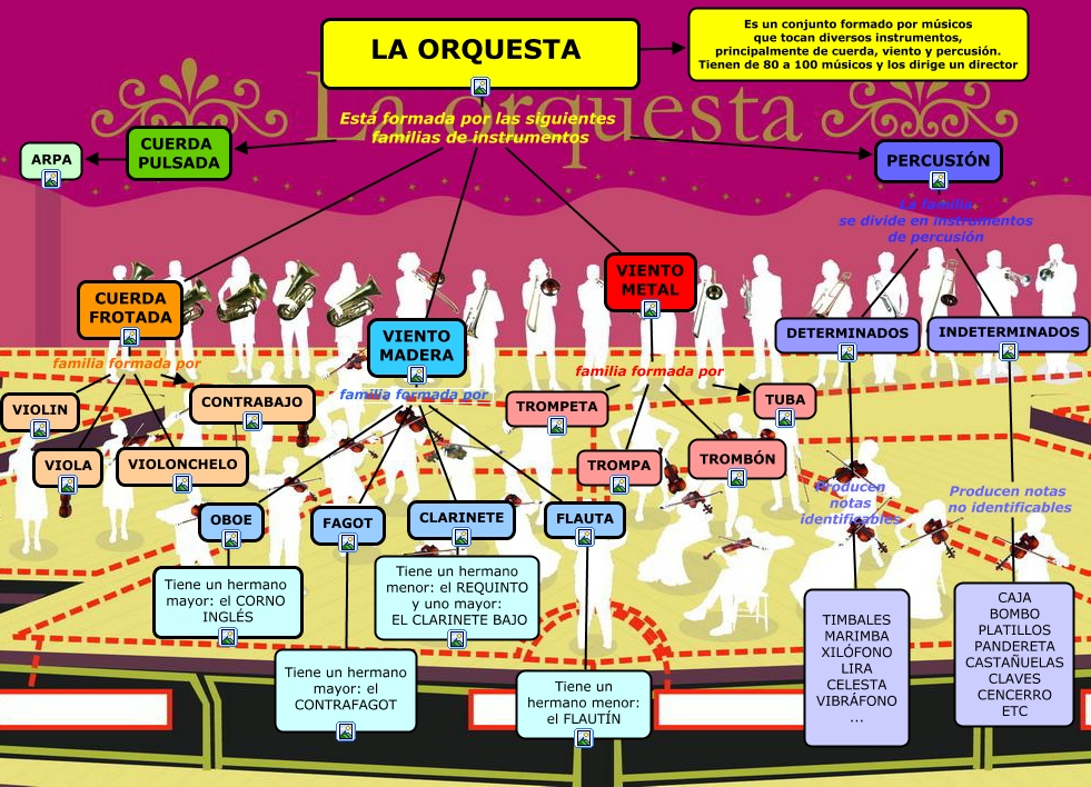 Este Cmap, tiene información relacionada con: INSTRUMENTOS DE LA ORQUESTA, LA ORQUESTA Está formada por las siguientes familias de instrumentos CUERDA PULSADA, VIENTO MADERA familia formada por FLAUTA, INDETERMINADOS Producen notas no identificables CAJA BOMBO PLATILLOS PANDERETA CASTAÑUELAS CLAVES CENCERRO ETC, LA ORQUESTA Está formada por las siguientes familias de instrumentos PERCUSIÓN, LA ORQUESTA Está formada por las siguientes familias de instrumentos VIENTO MADERA, PERCUSIÓN La familia se divide en instrumentos de percusión INDETERMINADOS, FAGOT ???? Tiene un hermano mayor: el CONTRAFAGOT, CUERDA FROTADA familia formada por VIOLA, CUERDA FROTADA familia formada por VIOLONCHELO, VIENTO METAL familia formada por TROMPA, PERCUSIÓN La familia se divide en instrumentos de percusión DETERMINADOS, VIENTO METAL familia formada por TROMBÓN, VIENTO MADERA familia formada por FAGOT, OBOE ???? Tiene un hermano mayor: el CORNO INGLÉS, DETERMINADOS Producen notas identificables TIMBALES MARIMBA XILÓFONO LIRA CELESTA VIBRÁFONO ..., CUERDA FROTADA familia formada por CONTRABAJO, CLARINETE ???? Tiene un hermano menor: el REQUINTO y uno mayor: EL CLARINETE BAJO, LA ORQUESTA ???? Es un conjunto formado por músicos que tocan diversos instrumentos, principalmente de cuerda, viento y percusión. Tienen de 80 a 100 músicos y los dirige un director, LA ORQUESTA Está formada por las siguientes familias de instrumentos CUERDA FROTADA, VIENTO MADERA familia formada por OBOE
