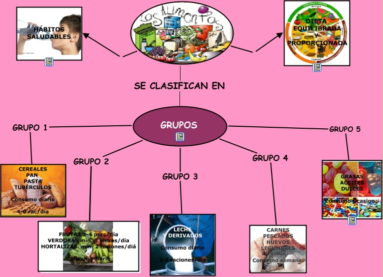Este Cmap, tiene información relacionada con: MAPA CONCEPTUAL LOS ALIMENTOS, GRUPOS GRUPO 4 CARNES PESCADOS HUEVOS LEGUMBRES Consumo semanal, GRUPOS GRUPO 3 LECHE Y DERIVADOS Consumo diario 3-4 raciones/día, GRUPOS GRUPO 5 GRASAS ACEITES DULCES Consumo Ocasional, SE CLASIFICAN EN GRUPOS, GRUPOS GRUPO 2 FRUTAS 2-4 porc/día VERDURAS mín. 3 piezas/día HORTALIZAS. min. 2 raciones/diá Consumo diario, DIETA EQUILIBRADA Y PROPORCIONADA, HÁBITOS SALUDABLES, GRUPOS GRUPO 1 CEREALES PAN PASTA TUBÉRCULOS Consumo diario 4-6 rac/día