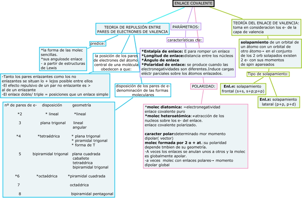 Este Cmap, tiene información relacionada con: enlace covalente 2 (maria tasa), solapamiento de un orbital de un átomo con un orbital de otro átomo→ en el conjunto de los 2 orb solapados existen 2 e- con sus momentos de spin apareados Tipo de solapamiento: Enl.σ: solapamiento frontal (s+s, s+p;p+p), POLARIDAD: *molec diatomica: =electronegatividad enlace covalente puro *molec heteroatómica:≠atracción de los nucleos sobre los e- del enlace. enlace covalente polarizado. caracter polar:determinado mor momento dipolar( vector) molec formada por 2 o + at.:su polaridad depende tmbien de su geometría. -A veces los enlaces se anulan unos a otros y la molec es globalmente apolar. -a veces molec con enlaces polares→ momento dipolar global, ENLACE COVALENTE POLARIDAD:, TEORIA DE REPULSIÓN ENTRE PARES DE ELECTRONES DE VALENCIA disposición de los pares de e- denominación de las formas moleculares nº de pares de e- disposición geometría *2 * lineal *lineal 3 plana trigonal lineal angular *4 *tetraédrica * plana trigonal * piramidal trigonal * forma de T 5 bipiramidal trigonal plana cuadrada caballete tetraédrica bipiramidal trigonal *6 *octaédrica *piramidal cuadrada 7 octaédrica 8 bipiramidal pentagonal, ENLACE COVALENTE TEORIA DE REPULSIÓN ENTRE PARES DE ELECTRONES DE VALENCIA, ENLACE COVALENTE ???? TEORÍA DEL ENLACE DE VALENCIA: toma en consideracíon los e- de la capa de valencia, ENLACE COVALENTE PARÁMETROS:, TEORIA DE REPULSIÓN ENTRE PARES DE ELECTRONES DE VALENCIA la posición de los pares de electrones del átomo central de una molécula obedecen a que: -Tanto los pares enlazantes como los no enlazantes se situan lo + lejos posible entre ellos -El efecto repulsivo de un par no enlazante es > al de un enlazante -El enlace doble/ triple = posiciones que un enlace simple, PARÁMETROS: características cte: *Entalpía de enlace: E para romper un enlace *Longitud de enlace:distancia entre los núcleos *Ángulo de enlace *Polaridad de enlace: se produce cuando las electronegatividades son diferentes.Induce cargas eléctr parciales sobre los átomos enlazados., TEORÍA DEL ENLACE DE VALENCIA: toma en consideracíon los e- de la capa de valencia solapamiento de un orbital de un átomo con un orbital de otro átomo→ en el conjunto de los 2 orb solapados existen 2 e- con sus momentos de spin apareados, TEORIA DE REPULSIÓN ENTRE PARES DE ELECTRONES DE VALENCIA predice: *la forma de las molec sencillas. *sus angulosde enlace - a partir de estructuras de Lewis, solapamiento de un orbital de un átomo con un orbital de otro átomo→ en el conjunto de los 2 orb solapados existen 2 e- con sus momentos de spin apareados Tipo de solapamiento: Enl.π: solapamiento lateral (p+p, p+d)
