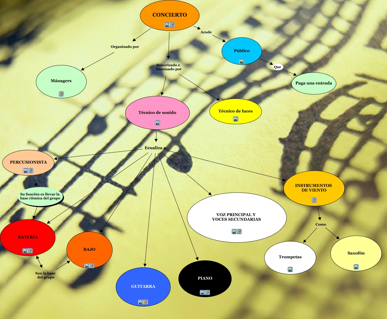 Este Cmap, tiene información relacionada con: Rock and Roll, Técnico de sonido Ecualiza a BAJO, Público Que Paga una entrada, Técnico de sonido Ecualiza a PIANO, Técnico de sonido Ecualiza a GUITARRA, BATERIA Son la base del grupo BAJO, Técnico de sonido Ecualiza a BATERIA, Técnico de sonido Ecualiza a PERCUSIONISTA, INSTRUMENTOS DE VIENTO Como Trompetas, Técnico de sonido Ecualiza a VOZ PRINCIPAL Y VOCES SECUNDARIAS, CONCIERTO Sonorizado e iluminado por Técnico de luces, INSTRUMENTOS DE VIENTO Como Saxofón, Técnico de sonido Ecualiza a INSTRUMENTOS DE VIENTO, CONCIERTO Acude Público, CONCIERTO Organizado por Mánagers, CONCIERTO Sonorizado e iluminado por Técnico de sonido, PERCUSIONISTA Su función es llevar la base rítmica del grupo BATERIA
