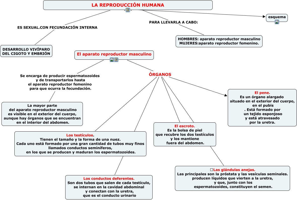 Este Cmap, tiene información relacionada con: LA REPRODUCCIÓN HUMANA, LA REPRODUCCIÓN HUMANA ES SEXUAL.CON FECUNDACIÓN INTERNA DESARROLLO VIVÍPARO DEL CIGOTO Y EMBRIÓN, LA REPRODUCCIÓN HUMANA ???? esquema, El aparato reproductor masculino ÓRGANOS Los testículos. Tienen el tamaño y la forma de una nuez. Cada uno está formado por una gran cantidad de tubos muy finos llamados conductos seminíferos, en los que se producen y maduran los espermatozoides., LA REPRODUCCIÓN HUMANA PARA LLEVARLA A CABO: HOMBRES: aparato reproductor masculino MUJERES:aparato reproductor femenino., El aparato reproductor masculino ÓRGANOS Los conductos deferentes. Son dos tubos que salen de cada testículo, se internan en la cavidad abdominal y conectan con la uretra, que es el conducto urinario, El aparato reproductor masculino ÓRGANOS El escroto. Es la bolsa de piel que recubre los dos testículos y los mantiene fuera del abdomen., El aparato reproductor masculino Se encarga de producir espermatozoides y de transportarlos hasta el aparato reproductor femenino para que ocurra la fecundación. La mayor parte del aparato reproductor masculino es visible en el exterior del cuerpo, aunque hay órganos que se encuentran en el interior del abdomen., El aparato reproductor masculino ÓRGANOS El pene. Es un órgano alargado situado en el exterior del cuerpo, en el pubis . Está formado por un tejido esponjoso y está atravesado por la uretra., El aparato reproductor masculino ÓRGANOS Las glándulas anejas. Las principales son la próstata y las vesículas seminales. producen líquidos que vierten a la uretra, y que, junto con los espermatozoides, constituyen el semen.