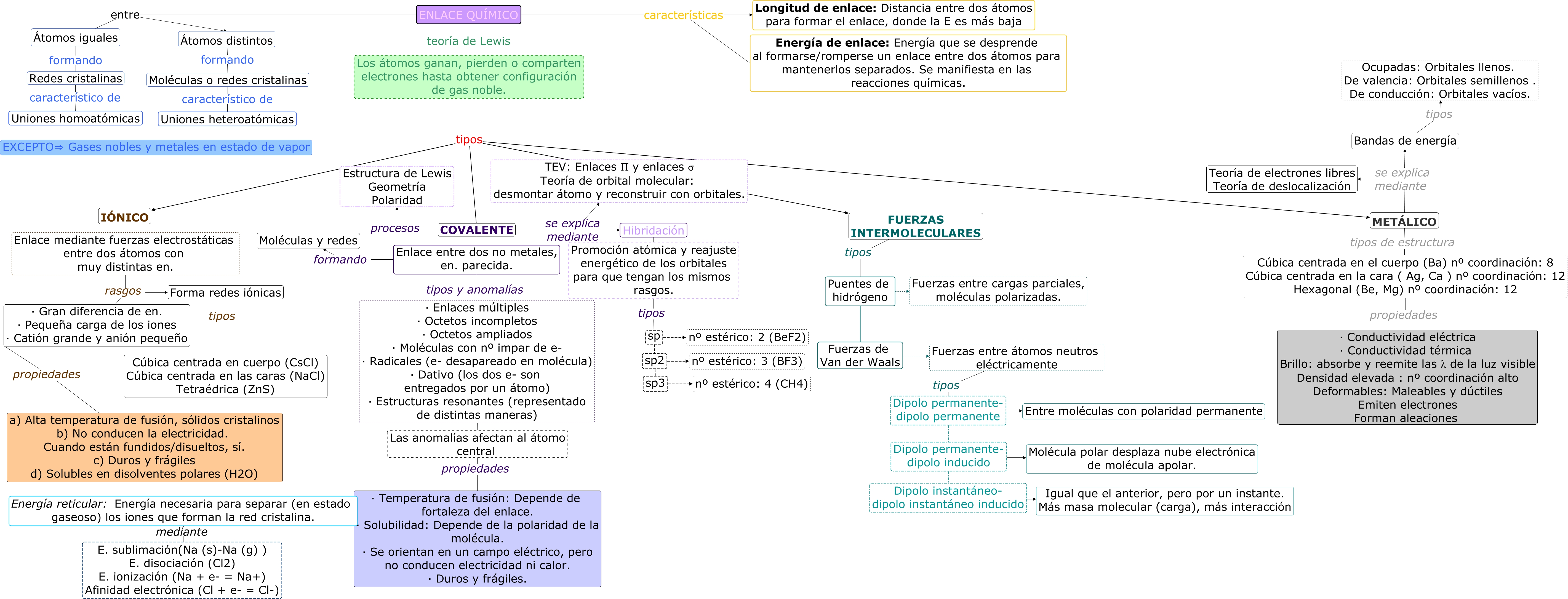 de gas noble. </mtext> </mrow> </math> tipos IÓNICO, Dipolo permanente- dipolo inducido Molécula polar desplaza nube electrónica de molécula apolar., COVALENTE se explica mediante Hibridación, METÁLICO se explica mediante Bandas de energía, Las anomalías afectan al átomo central propiedades · Temperatura de fusión: Depende de fortaleza del enlace. · Solubilidad: Depende de la polaridad de la molécula. · Se orientan en un campo eléctrico, pero no conducen electricidad ni calor. · Duros y frágiles., Enlace mediante fuerzas electrostáticas entre dos átomos con muy distintas en. rasgos · Gran diferencia de en. · Pequeña carga de los iones · Catión grande y anión pequeño, METÁLICO se explica mediante Teoría de electrones libres Teoría de deslocalización, Bandas de energía tipos Ocupadas: Orbitales llenos. De valencia: Orbitales semillenos . De conducción: Orbitales vacíos., sp nº estérico: 2 (BeF2), Fuerzas de Van der Waals Fuerzas entre átomos neutros eléctricamente, · Enlaces múltiples · Octetos incompletos · Octetos ampliados · Moléculas con nº impar de e- · Radicales (e- desapareado en molécula) · Dativo (los dos e- son entregados por un átomo) · Estructuras resonantes (representado de distintas maneras) Las anomalías afectan al átomo central, · Gran diferencia de en. · Pequeña carga de los iones · Catión grande y anión pequeño propiedades <math xmlns="http://www.w3.org/1998/Math/MathML"> <mrow> <mtext> a) Alta temperatura de fusión, sólidos cristalinos