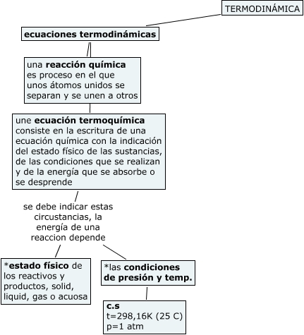 Este Cmap, tiene información relacionada con: termodinamica( maria tasa), ecuaciones termodinámicas une ecuación termoquímica consiste en la escritura de una ecuación química con la indicación del estado físico de las sustancias, de las condiciones que se realizan y de la energía que se absorbe o se desprende, une ecuación termoquímica consiste en la escritura de una ecuación química con la indicación del estado físico de las sustancias, de las condiciones que se realizan y de la energía que se absorbe o se desprende se debe indicar estas circustancias, la energía de una reaccion depende *estado físico de los reactivos y productos, solid, liquid, gas o acuosa, *las condiciones de presión y temp. c.s t=298,16K (25 C) p=1 atm, ecuaciones termodinámicas una reacción química es proceso en el que unos átomos unidos se separan y se unen a otros, une ecuación termoquímica consiste en la escritura de una ecuación química con la indicación del estado físico de las sustancias, de las condiciones que se realizan y de la energía que se absorbe o se desprende se debe indicar estas circustancias, la energía de una reaccion depende *las condiciones de presión y temp., TERMODINÁMICA ecuaciones termodinámicas