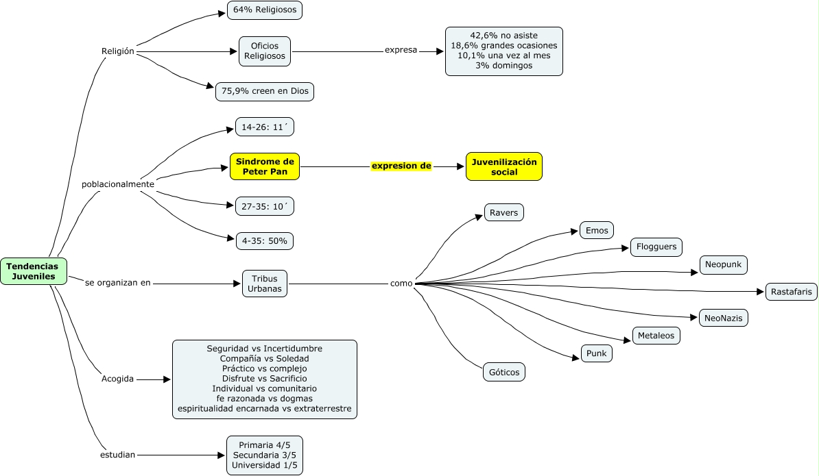 Este Cmap, tiene información relacionada con: jovenes, Tribus Urbanas como Metaleos, Tendencias Juveniles Religión 75,9% creen en Dios, Tribus Urbanas como Flogguers, Tendencias Juveniles Religión Oficios Religiosos, Tendencias Juveniles se organizan en Tribus Urbanas, Tribus Urbanas como Ravers, Tribus Urbanas como Rastafaris, Sindrome de Peter Pan expresion de Juvenilización social, Tribus Urbanas como Neopunk, Tribus Urbanas como Punk, Tendencias Juveniles poblacionalmente 4-35: 50%, Tendencias Juveniles poblacionalmente 27-35: 10´, Oficios Religiosos expresa 42,6% no asiste 18,6% grandes ocasiones 10,1% una vez al mes 3% domingos, Tendencias Juveniles Religión 64% Religiosos, Tendencias Juveniles Acogida Seguridad vs Incertidumbre Compañía vs Soledad Práctico vs complejo Disfrute vs Sacrificio Individual vs comunitario fe razonada vs dogmas espiritualidad encarnada vs extraterrestre, Tribus Urbanas como Góticos, Tendencias Juveniles poblacionalmente 14-26: 11´, Tendencias Juveniles poblacionalmente Sindrome de Peter Pan, Tendencias Juveniles estudian Primaria 4/5 Secundaria 3/5 Universidad 1/5, Tribus Urbanas como NeoNazis
