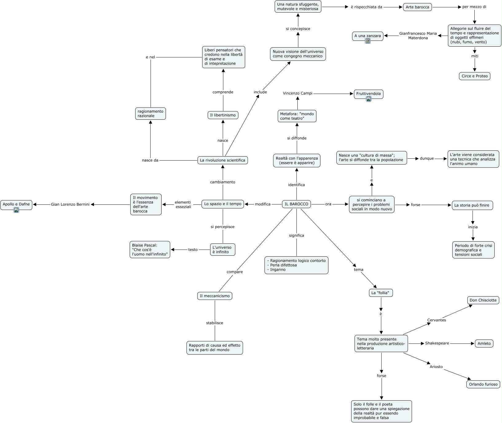 Questa Cmap, creata con IHMC CmapTools, contiene informazioni relative a: Mappa Barocco - Paolo Frigerio, Lo spazio e il tempo cambiamento La rivoluzione scientifica, La rivoluzione scientifica include Nuova visione dell'universo come congegno meccanico, IL BAROCCO significa - Ragionamento logico contorto - Perla difettosa - Inganno, Il meccanicismo stabilisce Rapporti di causa ed effetto tra le parti del mondo, si cominciano a percepire i problemi sociali in modo nuovo e Nasce una "cultura di massa"; l'arte si diffonde tra la popolazione, La rivoluzione scientifica nasce Il libertinismo, IL BAROCCO identifica Realtà con l'apparenza (essere è apparire), L'universo è infinito testo Blaise Pascal: "Che cos'è l'uomo nell'infinito", Tema molto presente nella produzione artistico- letteraria Ariosto Orlando furioso, Il libertinismo comprende Liberi pensatori che credono nella libertà di esame e di intepretazione, Tema molto presente nella produzione artistico- letteraria forse Solo il folle e il poeta possono dare una spiegazione della realtà pur essendo improbabile e falsa, Una natura sfuggente, mutevole e misteriosa è rispecchiata da Arte barocca, Realtà con l'apparenza (essere è apparire) si diffonde Metafora: "mondo come teatro", Il movimento è l'essenza dell'arte barocca Gian Lorenzo Bernini Apollo e Dafne, IL BAROCCO compare Il meccanicismo, Tema molto presente nella produzione artistico- letteraria Cervantes Don Chisciotte, Tema molto presente nella produzione artistico- letteraria Shakespeare Amleto, Allegorie sul fluire del tempo e rappresentazione di oggetti effimeri (nubi, fumo, vento) miti Circe e Proteo, Arte barocca per mezzo di Allegorie sul fluire del tempo e rappresentazione di oggetti effimeri (nubi, fumo, vento), La rivoluzione scientifica nasce da ragionamento razionale