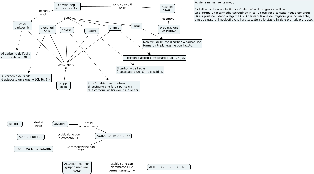 Questa Cmap, creata con IHMC CmapTools, contiene informazioni relative a: SNAC, derivati degli acidi carbossilici sono ammidi, anidridi contengono il gruppo acile, NITRILE idrolisi acida AMMIDE, esteri Il carbonio dell'acile è attaccato a un -OR(alcossido)., ammidi Il carbonio acilico è attaccato a un -NH(R)., derivati degli acidi carbossilici basati sugli acidi carbossilici, alogenuri acilici Al carbonio dell'acile è attaccato un alogeno (Cl, Br, I )., anidridi in un'anidride ho un atomo di ossigeno che fa da ponte tra due carbonili acilici cioè tra due acili, acidi carbossilici contengono il gruppo acile, esteri contengono il gruppo acile, ammidi contengono il gruppo acile, derivati degli acidi carbossilici sono nitrili, ALCHILARENI con gruppo metilene -CH2- ossidazione con bicromato/H+ o permanganato/H+ ACIDI CARBOSSIL-ARENICI, alogenuri acilici contengono il gruppo acile, nitrili Non c'è l'acile, ma il carbonio carbonilico forma un triplo legame con l'azoto., AMMIDE idrolisi acida o basica ACIDO CARBOSSILICO, derivati degli acidi carbossilici sono alogenuri acilici, derivati degli acidi carbossilici sono coinvolti nelle reazioni SNAC, acidi carbossilici Al carbonio dell'acile è attaccato un -OH., Avviene nel seguente modo: 1) l'attacco di un nucleofilo sul C elettrofilo di un gruppo acilico; 2) si forma un intermedio tetraedrico in cui un ossigeno caricato negativamente; 3) si ripristina il doppio legame C=O per espulsione del migliore gruppo uscente, che può essere il nucleofilo che ha attaccato nello stadio iniziale o un altro gruppo. ???? reazioni SNAC