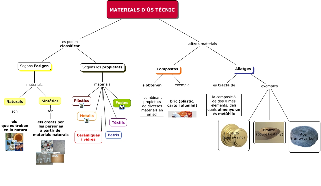 Este Cmap, tiene información relacionada con: Materials d'ús tècnic, MATERIALS D'ÚS TÈCNIC altres materials Aliatges, Compostos exemple bric (plàstic, cartó i alumini), Aliatges exemples Acer (ferro+carboni), Aliatges es tracta de la composició de dos o més elements, dels quals almenys un és metàl·lic, Segons les propietats materials Fustes, MATERIALS D'ÚS TÈCNIC es poden classificar Segons l'origen, Segons les propietats materials Tèxtils, Aliatges exemples Bronze (coure+estany), Naturals són els que es troben en la natura, MATERIALS D'ÚS TÈCNIC altres materials Compostos, Segons l'origen materials Naturals, Aliatges exemples Llautó (coure+zinc), Compostos s'obtenen combinant propietats de diversos materials en un sol, Segons les propietats materials Petris, Sintètics són els creats per les persones a partir de materials naturals, Segons les propietats materials Plàstics, MATERIALS D'ÚS TÈCNIC es poden classificar Segons les propietats, Segons les propietats materials Metalls, Segons l'origen materials Sintètics, Segons les propietats materials Ceràmiques i vidres