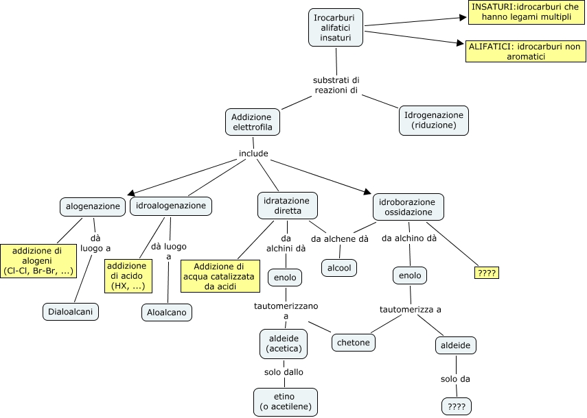Questa Cmap, creata con IHMC CmapTools, contiene informazioni relative a: insani, enolo tautomerizzano a aldeide (acetica), enolo tautomerizza a aldeide, idroalogenazione addizione di acido (HX, ...), Irocarburi alifatici insaturi INSATURI:idrocarburi che hanno legami multipli, idroalogenazione dà luogo a Aloalcano, aldeide solo da ????, aldeide (acetica) solo dallo etino (o acetilene), alogenazione dà luogo a Dialoalcani, enolo tautomerizza a chetone, idratazione diretta da alchini dà enolo, idratazione diretta da alchene dà alcool, Addizione elettrofila include idratazione diretta, Irocarburi alifatici insaturi substrati di reazioni di Idrogenazione (riduzione), Irocarburi alifatici insaturi substrati di reazioni di Addizione elettrofila, Irocarburi alifatici insaturi ALIFATICI: idrocarburi non aromatici, Addizione elettrofila include idroborazione ossidazione, enolo tautomerizzano a chetone, Addizione elettrofila include idroalogenazione, idroborazione ossidazione ????, idratazione diretta Addizione di acqua catalizzata da acidi