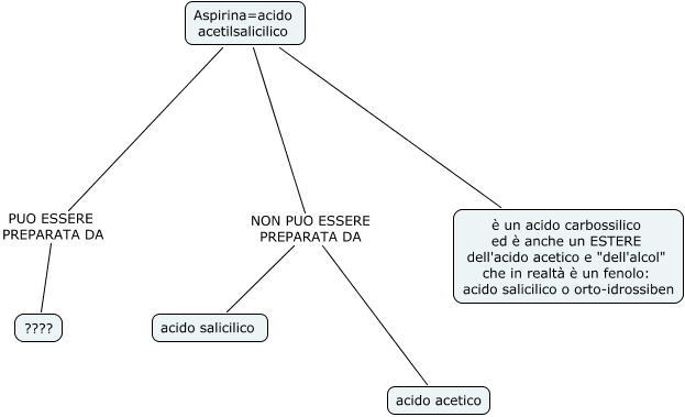 Questa Cmap, creata con IHMC CmapTools, contiene informazioni relative a: aspirina, Aspirina=acido acetilsalicilico NON PUO ESSERE PREPARATA DA acido salicilico, Aspirina=acido acetilsalicilico è un acido carbossilico ed è anche un ESTERE dell'acido acetico e "dell'alcol" che in realtà è un fenolo: acido salicilico o orto-idrossiben, Aspirina=acido acetilsalicilico NON PUO ESSERE PREPARATA DA acido acetico, Aspirina=acido acetilsalicilico PUO ESSERE PREPARATA DA ????