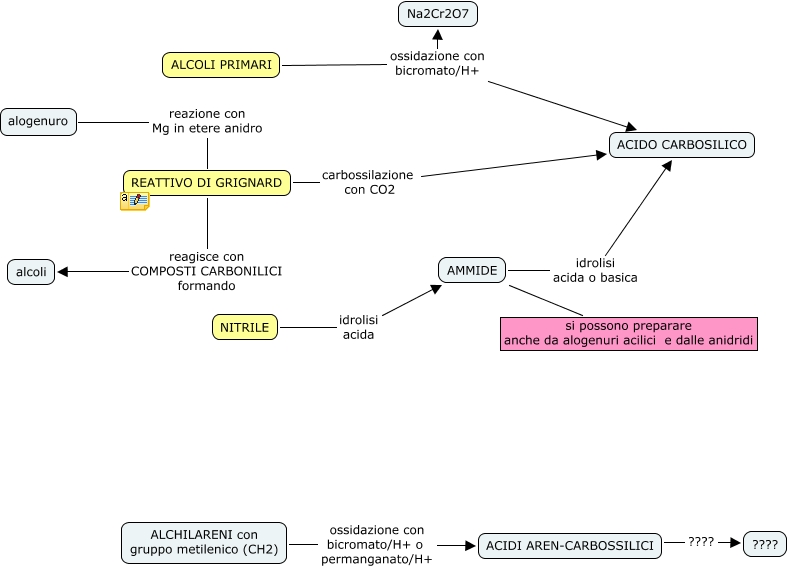 Questa Cmap, creata con IHMC CmapTools, contiene informazioni relative a: pag 200, ALCHILARENI con gruppo metilenico (CH2) ossidazione con bicromato/H+ o permanganato/H+ ACIDI AREN-CARBOSSILICI, NITRILE idrolisi acida AMMIDE, AMMIDE idrolisi acida o basica ACIDO CARBOSILICO, ALCOLI PRIMARI ossidazione con bicromato/H+ Na2Cr2O7, AMMIDE si possono preparare anche da alogenuri acilici e dalle anidridi, alogenuro reazione con Mg in etere anidro REATTIVO DI GRIGNARD, REATTIVO DI GRIGNARD reagisce con COMPOSTI CARBONILICI formando alcoli, ALCOLI PRIMARI ossidazione con bicromato/H+ ACIDO CARBOSILICO, ACIDI AREN-CARBOSSILICI ???? ????, REATTIVO DI GRIGNARD carbossilazione con CO2 ACIDO CARBOSILICO