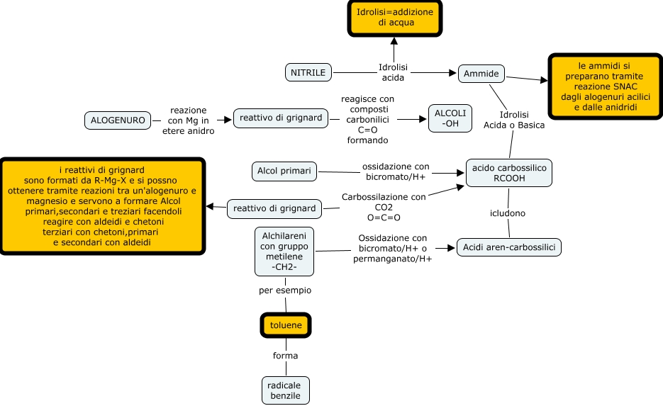 Questa Cmap, creata con IHMC CmapTools, contiene informazioni relative a: Reazioni 21 marzo, acido carbossilico RCOOH icludono Acidi aren-carbossilici, reattivo di grignard reagisce con composti carbonilici C=O formando ALCOLI -OH, Ammide Idrolisi Acida o Basica acido carbossilico RCOOH, Alcol primari ossidazione con bicromato/H+ acido carbossilico RCOOH, reattivo di grignard i reattivi di grignard sono formati da R-Mg-X e si possno ottenere tramite reazioni tra un'alogenuro e magnesio e servono a formare Alcol primari,secondari e treziari facendoli reagire con aldeidi e chetoni terziari con chetoni,primari e secondari con aldeidi, ALOGENURO reazione con Mg in etere anidro reattivo di grignard, NITRILE Idrolisi acida Idrolisi=addizione di acqua, Ammide le ammidi si preparano tramite reazione SNAC dagli alogenuri acilici e dalle anidridi, reattivo di grignard Carbossilazione con CO2 O=C=O acido carbossilico RCOOH, NITRILE Idrolisi acida Ammide, Alchilareni con gruppo metilene -CH2- Ossidazione con bicromato/H+ o permanganato/H+ Acidi aren-carbossilici, Alchilareni con gruppo metilene -CH2- per esempio toluene, toluene forma radicale benzile