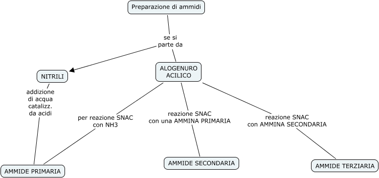 Questa Cmap, creata con IHMC CmapTools, contiene informazioni relative a: Preparazione ammidi, ALOGENURO ACILICO per reazione SNAC con NH3 AMMIDE PRIMARIA, Preparazione di ammidi se si parte da ALOGENURO ACILICO, NITRILI addizione di acqua catalizz. da acidi AMMIDE PRIMARIA, ALOGENURO ACILICO reazione SNAC con una AMMINA PRIMARIA AMMIDE SECONDARIA, ALOGENURO ACILICO reazione SNAC con AMMINA SECONDARIA AMMIDE TERZIARIA, Preparazione di ammidi se si parte da NITRILI