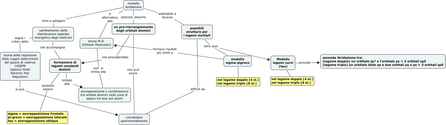 Questa Cmap, creata con IHMC CmapTools, contiene informazioni relative a: ibridazione, un pre-riarrangiamento degli orbitali atomici che precederebbe formazione di legami covalenti distinti, possibili strutture per i legami multipli sono due: modello sigma-pigreco, modello sigma-pigreco nel legame doppio (4 el.) nel legame triplo (6 el.), Modello legami curvi (tau) nel legame doppio (4 el.) nel legame triplo (6 el.), modello ibridazione ipotizza, assume un pre-riarrangiamento degli orbitali atomici, possibili strutture per i legami multipli sono due: Modello legami curvi (tau), possibili strutture per i legami multipli difficili da convalidare sperimentalmente, formazione di legami covalenti distinti possono essere sigma = sovrapposizione frontale pi-greco = sovrapposizione laterale tau = sovrapposizione obliqua, modello ibridazione adattabile a diverse possibili strutture per i legami multipli, cambiamento della distribuzione spaziale energetica degli elettroni che accompagna formazione di legami covalenti distinti, teoria della repulsione delle coppie elettroniche del guscio di valenza (VSEPR Valence Shell Electron Pair Repulsion) si può convalidare sperimentalmente, Modello legami curvi (tau) prevede seconda ibridazione tra: (legame doppio) un orbitale sp² e l'orbitale pz = 2 orbitali sp5 (legame triplo) un orbitale ibido sp e due orbitali py e pz = 3 orbitali sp5, modello sigma-pigreco fornisce risultati più simili a teoria M.O. (Orbitali Molecolari), teoria M.O. (Orbitali Molecolari) non si limita alla sovrapposizione o combinazione tra orbitali atomici nella zona di spazio tra due soli atomi, modello ibridazione mira a spiegare cambiamento della distribuzione spaziale energetica degli elettroni, modello ibridazione è alternativo alla teoria M.O. (Orbitali Molecolari), formazione di legami covalenti distinti limitati alla sovrapposizione o combinazione tra orbitali atomici nella zona di spazio tra due soli atomi, cambiamento della distribuzione spaziale energetica degli elettroni segue i criteri della teoria della repulsione delle coppie elettroniche del guscio di valenza (VSEPR Valence Shell Electron Pair Repulsion), un pre-riarrangiamento degli orbitali atomici non può avere convalidare sperimentalmente