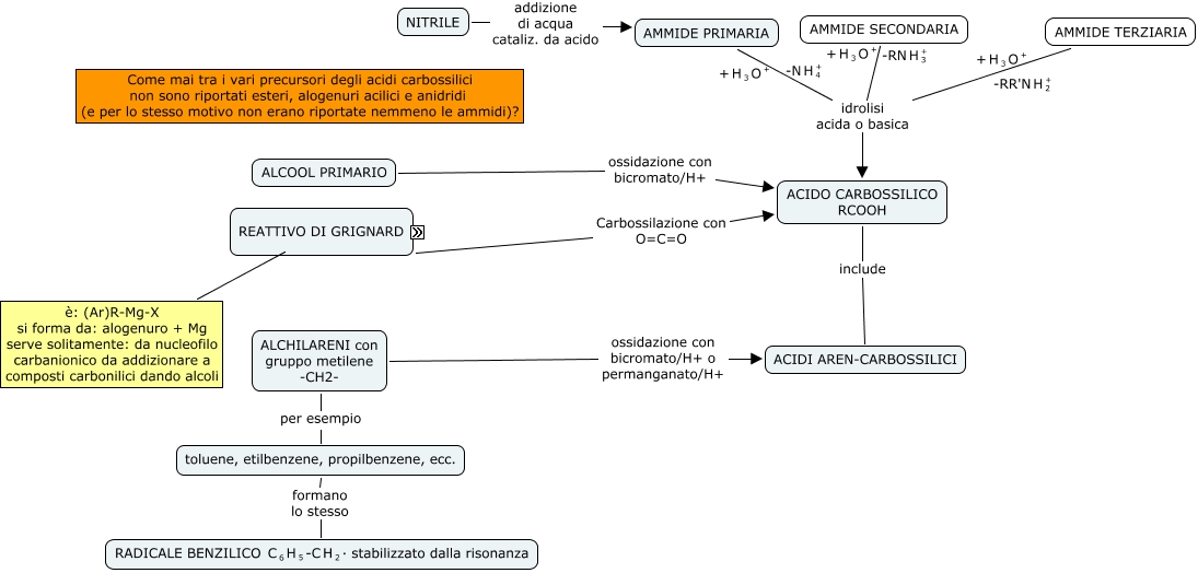 Questa Cmap, creata con IHMC CmapTools, contiene informazioni relative a: acidi, ALCHILARENI con gruppo metilene -CH2- ossidazione con bicromato/H+ o permanganato/H+ ACIDI AREN-CARBOSSILICI, AMMIDE PRIMARIA idrolisi acida o basica ACIDO CARBOSSILICO RCOOH, toluene, etilbenzene, propilbenzene, ecc. formano lo stesso <math xmlns="http://www.w3.org/1998/Math/MathML"> <mrow> <mtext> RADICALE BENZILICO </mtext> <mmultiscripts> <mtext> C </mtext> <mtext> 6 </mtext> <none/> </mmultiscripts> <mmultiscripts> <mtext> H </mtext> <mtext> 5 </mtext> <none/> </mmultiscripts> <mtext> -C </mtext> <mmultiscripts> <mtext> H </mtext> <mtext> 2 </mtext> <none/> </mmultiscripts> <mtext> · stabilizzato dalla risonanza </mtext> </mrow> </math>, AMMIDE SECONDARIA idrolisi acida o basica ACIDO CARBOSSILICO RCOOH, ALCOOL PRIMARIO ossidazione con bicromato/H+ ACIDO CARBOSSILICO RCOOH, REATTIVO DI GRIGNARD reagisce di solito con COMPOSTI CARBONILICI C=O formando ALCOLI -OH, REATTIVO DI GRIGNARD è: (Ar)R-Mg-X si forma da: alogenuro + Mg serve solitamente: da nucleofilo carbanionico da addizionare a composti carbonilici dando alcoli, ACIDO CARBOSSILICO RCOOH include ACIDI AREN-CARBOSSILICI, REATTIVO DI GRIGNARD Carbossilazione con O=C=O ACIDO CARBOSSILICO RCOOH, ALCHILARENI con gruppo metilene -CH2- per esempio toluene, etilbenzene, propilbenzene, ecc., AMMIDE TERZIARIA idrolisi acida o basica ACIDO CARBOSSILICO RCOOH, ALOGENURO reazione con Mg in etere anidro REATTIVO DI GRIGNARD, NITRILE addizione di acqua cataliz. da acido AMMIDE PRIMARIA