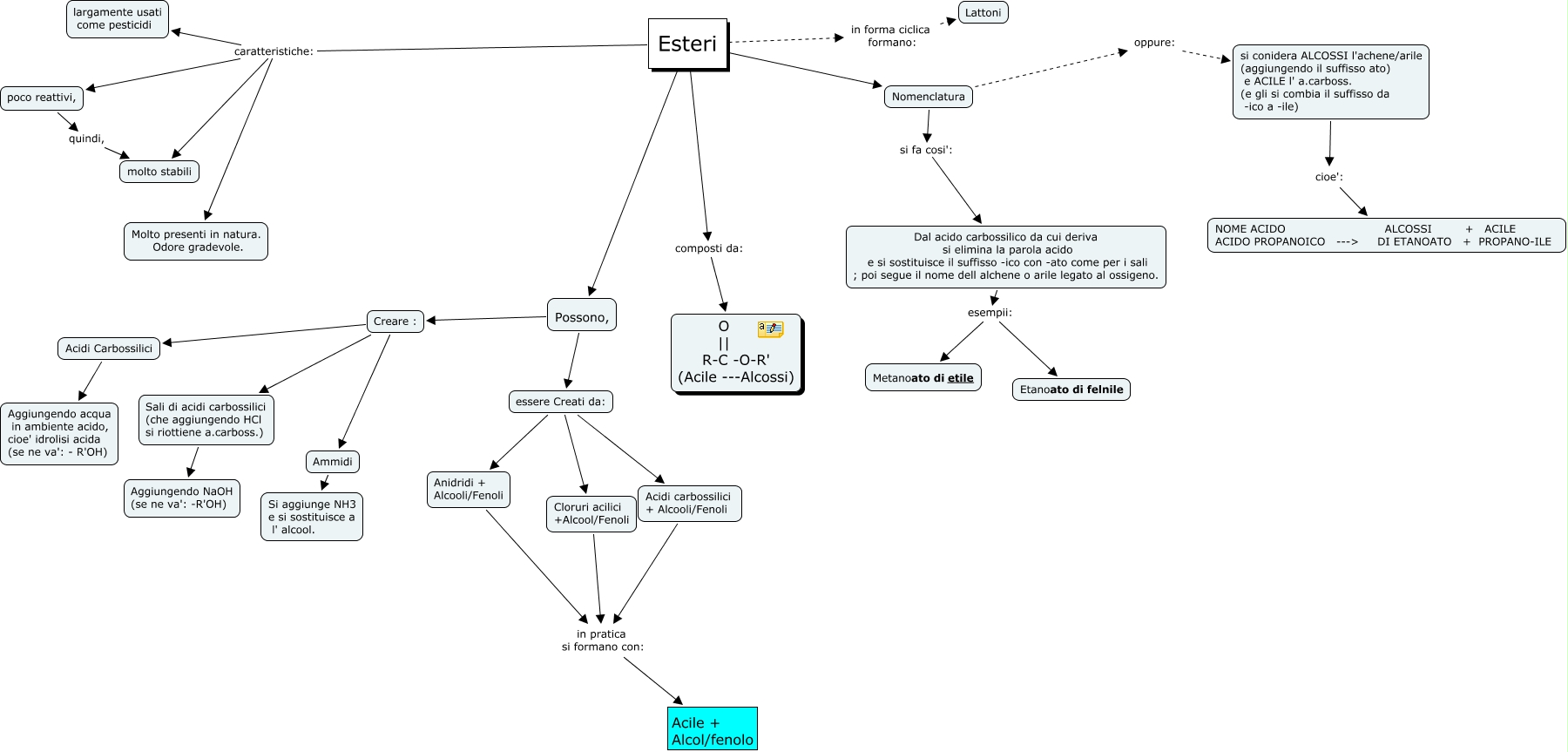 Questa Cmap, creata con IHMC CmapTools, contiene informazioni relative a: Esteri, Cloruri acilici +Alcool/Fenoli in pratica si formano con: Acile + Alcol/fenolo, Dal acido carbossilico da cui deriva si elimina la parola acido e si sostituisce il suffisso -ico con -ato come per i sali ; poi segue il nome dell alchene o arile legato al ossigeno. esempii: Etanoato di felnile, Esteri Possono,, Possono, essere Creati da:, Ammidi Si aggiunge NH3 e si sostituisce a l' alcool., Creare : Acidi Carbossilici, Esteri in forma ciclica formano: Lattoni, Anidridi + Alcooli/Fenoli in pratica si formano con: Acile + Alcol/fenolo, Sali di acidi carbossilici (che aggiungendo HCl si riottiene a.carboss.) Aggiungendo NaOH (se ne va': -R'OH), Nomenclatura oppure: si conidera ALCOSSI l'achene/arile (aggiungendo il suffisso ato) e ACILE l' a.carboss. (e gli si combia il suffisso da -ico a -ile), Esteri caratteristiche: Molto presenti in natura. Odore gradevole., Esteri composti da: O || R-C -O-R' (Acile ---Alcossi), Nomenclatura si fa cosi': Dal acido carbossilico da cui deriva si elimina la parola acido e si sostituisce il suffisso -ico con -ato come per i sali ; poi segue il nome dell alchene o arile legato al ossigeno., Esteri Nomenclatura, Dal acido carbossilico da cui deriva si elimina la parola acido e si sostituisce il suffisso -ico con -ato come per i sali ; poi segue il nome dell alchene o arile legato al ossigeno. esempii: Metanoato di etile, Creare : Ammidi, essere Creati da: Cloruri acilici +Alcool/Fenoli, Acidi carbossilici + Alcooli/Fenoli in pratica si formano con: Acile + Alcol/fenolo, Acidi Carbossilici Aggiungendo acqua in ambiente acido, cioe' idrolisi acida (se ne va': - R'OH), essere Creati da: Acidi carbossilici + Alcooli/Fenoli
