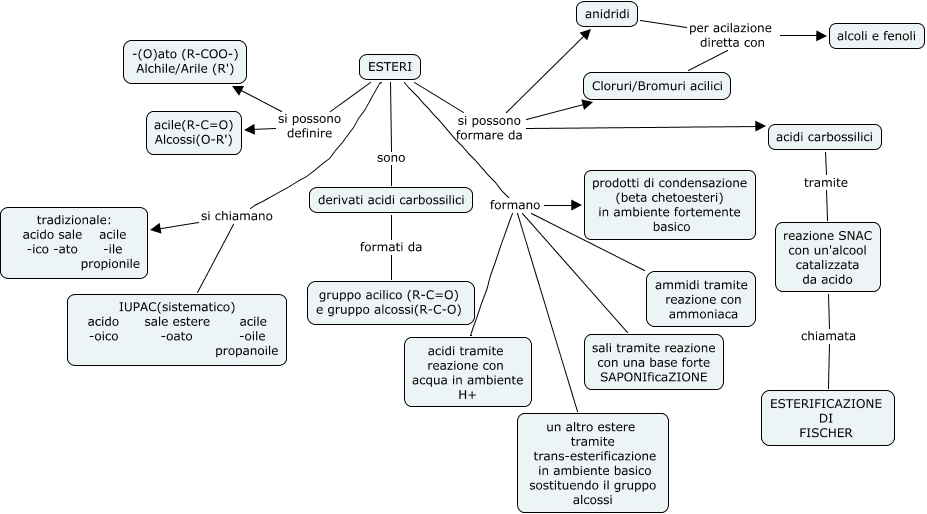 Questa Cmap, creata con IHMC CmapTools, contiene informazioni relative a: ESTERI, ESTERI si possono definire -(O)ato (R-COO-) Alchile/Arile (R'), ESTERI formano prodotti di condensazione (beta chetoesteri) in ambiente fortemente basico, Cloruri/Bromuri acilici per acilazione diretta con alcoli e fenoli, ESTERI formano ammidi tramite reazione con ammoniaca, ESTERI formano sali tramite reazione con una base forte SAPONIficaZIONE, reazione SNAC con un'alcool catalizzata da acido chiamata ESTERIFICAZIONE DI FISCHER, acidi carbossilici tramite reazione SNAC con un'alcool catalizzata da acido, ESTERI sono derivati acidi carbossilici, ESTERI si possono formare da Cloruri/Bromuri acilici, ESTERI si possono formare da acidi carbossilici, ESTERI si possono formare da anidridi, ESTERI si possono definire acile(R-C=O) Alcossi(O-R'), ESTERI si chiamano IUPAC(sistematico) acido sale estere acile -oico -oato -oile propanoile, anidridi per acilazione diretta con alcoli e fenoli, ESTERI formano acidi tramite reazione con acqua in ambiente H+, ESTERI si chiamano tradizionale: acido sale acile -ico -ato -ile propionile, ESTERI formano un altro estere tramite trans-esterificazione in ambiente basico sostituendo il gruppo alcossi, derivati acidi carbossilici formati da gruppo acilico (R-C=O) e gruppo alcossi(R-C-O)