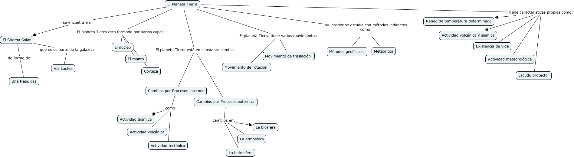 Este Cmap, tiene información relacionada con: proyecto planeta tierra, Cambios por Procesos internos como: Actividad Sísmica, El Planeta Tierra El planeta Tierra está formado por varias capas El manto, El Sitema Solar de formo de: Una Nebulosa, El Planeta Tierra El planeta Tierra tiene varios movimientos Movimiento de traslación, Cambios por Procesos externos cambios en: La biosfera, El Sitema Solar que es es parte de la galaxia: Via Lactea, El Planeta Tierra tiene caracteristicas propias como: Existencia de vida, El Planeta Tierra El planeta Tierra está en constante cambio Cambios por Procesos internos, El Planeta Tierra tiene caracteristicas propias como: Actividad meteorológica, El Planeta Tierra El planeta Tierra tiene varios movimientos Movimiento de rotación, El Planeta Tierra tiene caracteristicas propias como: Escudo protector, El Planeta Tierra tiene caracteristicas propias como: Rango de temperatura determinado, El Planeta Tierra tiene caracteristicas propias como: Actividad volcánica y sísmica, Cambios por Procesos internos como: Actividad tectónica, El Planeta Tierra se encuetra en: El Sitema Solar, Cambios por Procesos externos cambios en: La atmósfera, El Planeta Tierra su interior se estudia con métodos indirectos como: Métodos geofísicos, El Planeta Tierra su interior se estudia con métodos indirectos como: Meteoritos, Cambios por Procesos externos cambios en: La hidrosfera, Cambios por Procesos internos como: Actividad volcánica