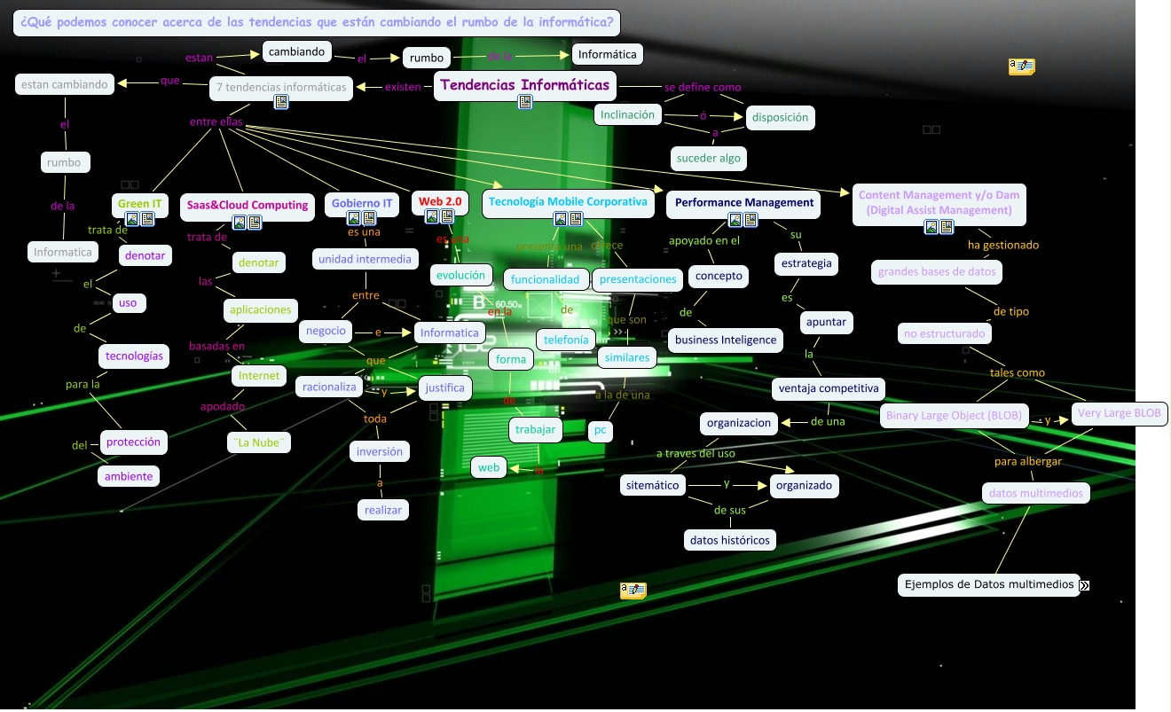 Este Cmap, tiene información relacionada con: Tendencias Maureen 12°b, no estructurado tales como Binary Large Object (BLOB), Performance Management su estrategia, no estructurado tales como Very Large BLOB, unidad intermedia entre Informatica, datos multimedios como imágenes, Binary Large Object (BLOB) y Very Large BLOB, Binary Large Object (BLOB) para albergar datos multimedios, unidad intermedia entre negocio, Informatica que racionaliza, Content Management y/o Dam (Digital Assist Management) ha gestionado grandes bases de datos, 7 tendencias informáticas estan cambiando, 7 tendencias informáticas entre ellas Green IT, racionaliza toda inversión, datos multimedios como mapas, trabajar la web, Tendencias Informáticas se define como disposición, Gobierno IT es una unidad intermedia, cambiando el rumbo, datos multimedios como expedientes, presentaciones que son similares