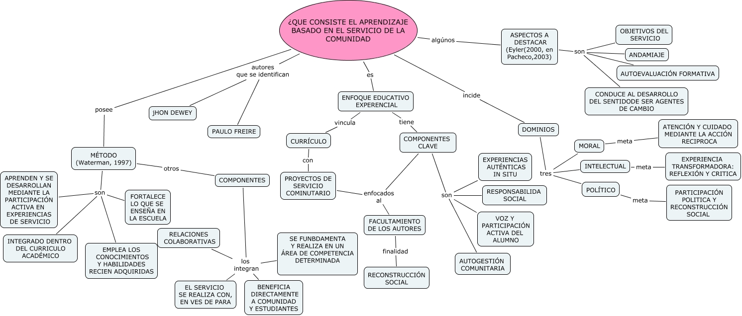 Este Cmap, tiene información relacionada con: CAPITULO IV.1EN QUE CONSISTE EL APRENDIZAJE BASADO, POLÍTICO meta PARTICIPACIÓN POLITICA Y RECONSTRUCCIÓN SOCIAL, COMPONENTES CLAVE son AUTOGESTIÓN COMUNITARIA, ¿QUE CONSISTE EL APRENDIZAJE BASADO EN EL SERVICIO DE LA COMUNIDAD algúnos ASPECTOS A DESTACAR (Eyler(2000, en Pacheco,2003), COMPONENTES CLAVE son EXPERIENCIAS AUTÉNTICAS IN SITU, MÉTODO (Waterman, 1997) son FORTALECE LO QUE SE ENSEÑA EN LA ESCUELA, MÉTODO (Waterman, 1997) son INTEGRADO DENTRO DEL CURRICULO ACADÉMICO, ASPECTOS A DESTACAR (Eyler(2000, en Pacheco,2003) son OBJETIVOS DEL SERVICIO, ASPECTOS A DESTACAR (Eyler(2000, en Pacheco,2003) son AUTOEVALUACIÓN FORMATIVA, ASPECTOS A DESTACAR (Eyler(2000, en Pacheco,2003) son CONDUCE AL DESARROLLO DEL SENTIDODE SER AGENTES DE CAMBIO, ASPECTOS A DESTACAR (Eyler(2000, en Pacheco,2003) son ANDAMIAJE, ¿QUE CONSISTE EL APRENDIZAJE BASADO EN EL SERVICIO DE LA COMUNIDAD autores que se identifican PAULO FREIRE, ¿QUE CONSISTE EL APRENDIZAJE BASADO EN EL SERVICIO DE LA COMUNIDAD posee MÉTODO (Waterman, 1997), COMPONENTES CLAVE son RESPONSABILIDA SOCIAL, ¿QUE CONSISTE EL APRENDIZAJE BASADO EN EL SERVICIO DE LA COMUNIDAD autores que se identifican jHON DEWEY, MÉTODO (Waterman, 1997) otros COMPONENTES, FACULTAMIENTO DE LOS AUTORES finalidad RECONSTRUCCIÓN SOCIAL, COMPONENTES CLAVE enfocados al PROYECTOS DE SERVICIO COMINUTARIO, DOMINIOS tres POLÍTICO, ENFOQUE EDUCATIVO EXPERENCIAL tiene COMPONENTES CLAVE, COMPONENTES los integran EL SERVICIO SE REALIZA CON, EN VES DE PARA