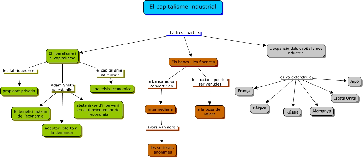 Este Cmap, tiene información relacionada con: tema 3, parte 4, L'expansió dels capitalismes industrial es va extendre a Alemanya, El capitalisme industrial hi ha tres apartats El liberalisme i el capitalisme, L'expansió dels capitalismes industrial es va extendre a Japó, L'expansió dels capitalismes industrial es va extendre a Estats Units, Els bancs i les finances la banca es va convertir en intermediària, El liberalisme i el capitalisme Adam Smith va establir abstenir-se d'intervenir en el funcionament de l'economia, El liberalisme i el capitalisme Adam Smith va establir El benefici màxim de l'economia, El capitalisme industrial hi ha tres apartats Els bancs i les finances, L'expansió dels capitalismes industrial es va extendre a Bèlgica, L'expansió dels capitalismes industrial es va extendre a França, L'expansió dels capitalismes industrial es va extendre a Rússia, El capitalisme industrial hi ha tres apartats L'expansió dels capitalismes industrial, intermediària llavors van sorgir les societats anònimes, Els bancs i les finances les accions podrien ser venudes a la bosa de valors, El liberalisme i el capitalisme Adam Smith va establir adaptar l'oferta a la demanda, El liberalisme i el capitalisme el capitalisme va causar una crisis economica, El liberalisme i el capitalisme les fàbriques eren propietat privada