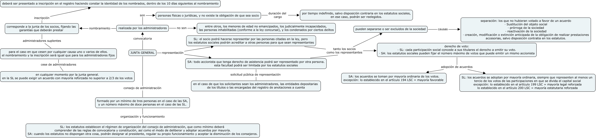 Este Cmap, tiene información relacionada con: junta general 2, para el caso en que cesen por cualquier causa uno o varios de ellos. el nombramiento y la inscripción será igual que para los administradores fijos cese de administradores en cualquier momento por la junta general. en la SL se puede exigir un acuerdo con mayoría reforzada no superior a 2/3 de los votos, corresponde a la junta de los socios, fijando las garantías que deberán prestar administradores suplentes para el caso en que cesen por cualquier causa uno o varios de ellos. el nombramiento y la inscripción será igual que para los administradores fijos, realizada por los administradores nombramiento corresponde a la junta de los socios, fijando las garantías que deberán prestar, realizada por los administradores son personas físicas o jurídicas, y no existe la obligación de que sea socio, corresponde a la junta de los socios, fijando las garantías que deberán prestar inscripción deberá ser presentado a inscripción en el registro haciendo constar la identidad de los nombrados, dentro de los 10 días siguientes al nombramiento, JUNTA GENERAL consejo de administración formado por un mínimo de tres personas en el caso de las SA, y un número máximo de doce personas en el caso de las SL., JUNTA GENERAL representación SA: todo accionista que tenga derecho de asistencia podrá ser representado por otra persona. esta facultad podrá ser limitada por los estatutos sociales, JUNTA GENERAL representación SL: el socio podrá hacerse representar por las personas citadas en la ley, pero los estatutos sociales podrán acreditar a otras personas para que sean representantes, SA: todo accionista que tenga derecho de asistencia podrá ser representado por otra persona. esta facultad podrá ser limitada por los estatutos sociales solicitud pública de representación en el caso de que los solicitantes sean los administradores, las entidades depositarias de los títulos o las encargadas del registro de anotaciones a cuenta, SL: el socio podrá hacerse representar por las personas citadas en la ley, pero los estatutos sociales podrán acreditar a otras personas para que sean representantes tanto los socios como los representantes pueden separarse o ser excluidos de la sociedad, JUNTA GENERAL convocatoria realizada por los administradores, derecho de voto: · SL: cada participación social concede a sus titulares el derecho a emitir su voto. · SA: los estatutos sociales pueden fijar el número máximo de votos que puede emitir un mismo accionista adopción de acuerdos SA: los acuerdos se toman por mayoría ordinaria de los votos. excepción: lo establecido en el artículo 194 LSC = mayoría favorable, formado por un mínimo de tres personas en el caso de las SA, y un número máximo de doce personas en el caso de las SL. organización y funcionamiento SL: los estatutos establecen el régimen de organización del consejo de administración, que como mínimo deberá comprender de las reglas de convocatoria y constitución, así como el modo de deliberar y adoptar acuerdos por mayoría. SA: cuando los estatutos no dispongan otra cosa, podrán designar al presidente, regular su propio funcionamiento y aceptar la disminución de los consejeros., derecho de voto: · SL: cada participación social concede a sus titulares el derecho a emitir su voto. · SA: los estatutos sociales pueden fijar el número máximo de votos que puede emitir un mismo accionista adopción de acuerdos SL: los acuerdos se adoptan por mayoría ordinaria, siempre que representen al menos un tercio de los votos de las participaciones en que se divida el capital social excepción: lo establecido en el artículo 199 LSC = mayoría legal reforzada lo establecido en el artículo 200 LSC = mayoría estatutaria reforzada, SL: el socio podrá hacerse representar por las personas citadas en la ley, pero los estatutos sociales podrán acreditar a otras personas para que sean representantes tanto los socios como los representantes derecho de voto: · SL: cada participación social concede a sus titulares el derecho a emitir su voto. · SA: los estatutos sociales pueden fijar el número máximo de votos que puede emitir un mismo accionista, SA: todo accionista que tenga derecho de asistencia podrá ser representado por otra persona. esta facultad podrá ser limitada por los estatutos sociales tanto los socios como los representantes derecho de voto: · SL: cada participación social concede a sus titulares el derecho a emitir su voto. · SA: los estatutos sociales pueden fijar el número máximo de votos que puede emitir un mismo accionista, SA: todo accionista que tenga derecho de asistencia podrá ser representado por otra persona. esta facultad podrá ser limitada por los estatutos sociales tanto los socios como los representantes pueden separarse o ser excluidos de la sociedad, personas físicas o jurídicas, y no existe la obligación de que sea socio duración del cargo por tiempo indefinido, salvo disposición contraria en los estatutos sociales, en ese caso, podrán ser reelegidos., realizada por los administradores no son entre otros, los menores de edad no emancipados, los judicialmente incapacidados, las personas inhabilitadas (conforme a la ley concursal), y los condenados por ciertos delitos, pueden separarse o ser excluidos de la sociedad causas separación: los que no hubieran votado a favor de un acuerdo · Sustitución del objeto social · prórroga de la sociedad · reactivación de la sociedad · creación, modificación o extinción anticipada de la obligación de realizar prestaciones accesorias, salvo disposición contratia en los estatutos.