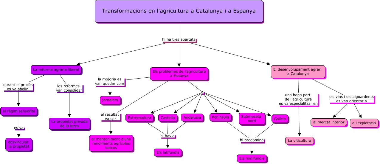 Este Cmap, tiene información relacionada con: tema 5, parte 2, Extremadura hi havia Els latifundis, El desenvolupament agrari a Catalunya una bona part de l'agricultura es va especialitzar en La viticultura, Els problemes de l'agricultura a Espanya a Castella, La reforma agrària liberal les reformes van consolidar La propietat privada de la terra, Transformacions en l'agricultura a Catalunya i a Espanya hi ha tres apartats El desenvolupament agrari a Catalunya, Els problemes de l'agricultura a Espanya a Andalusia, el règim senyorial es va desvincular la propietat, Transformacions en l'agricultura a Catalunya i a Espanya hi ha tres apartats La reforma agrària liberal, Peninsula hi predomina Els minifundis, Els problemes de l'agricultura a Espanya a Peninsula, Andalusia hi havia Els latifundis, Els problemes de l'agricultura a Espanya a Extremadura, Els problemes de l'agricultura a Espanya la mojoria es van quedar com jornalers, Els problemes de l'agricultura a Espanya a Submeseta nord, Els problemes de l'agricultura a Espanya el resultat va ser el manteniment d'uns rendiments agrícoles baixos, Transformacions en l'agricultura a Catalunya i a Espanya hi ha tres apartats Els problemes de l'agricultura a Espanya, Castella hi havia Els latifundis, El desenvolupament agrari a Catalunya els vins i els aiguardents es van orientar a al mercat interior, Galícia hi predomina Els minifundis, La reforma agrària liberal durant el procés es va abolir el règim senyorial