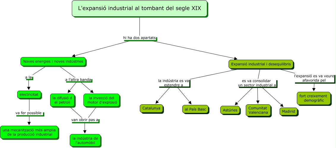 Este Cmap, tiene información relacionada con: tema 5, parte 5, Expansió industrial i desequilibris es va consolidar un sector industrial a Madirid, Expansió industrial i desequilibris la indústria es va estendre a al País Basc, la invecció del motor d'explosió van obrir pas a la indústria de l'automòbil, la difusió d el petroli van obrir pas a la indústria de l'automòbil, Noves energies i noves indústries a l'altra banda la difusió d el petroli, L'expansió industrial al tombant del segle XIX hi ha dos apartats Noves energies i noves indústries, L'expansió industrial al tombant del segle XIX hi ha dos apartats Expansió industrial i desequilibris, Expansió industrial i desequilibris es va consolidar un sector industrial a Astúries, Noves energies i noves indústries a l'altra banda la invecció del motor d'explosió, Expansió industrial i desequilibris l'expansió es va veure afavorida pel fort creixement demogràfic, Expansió industrial i desequilibris es va consolidar un sector industrial a Comunitat Valenciana, Expansió industrial i desequilibris la indústria es va estendre a Catalunya, electricitat va fer possible una mecanització més amplia de la producció industrial, Noves energies i noves indústries a la electricitat
