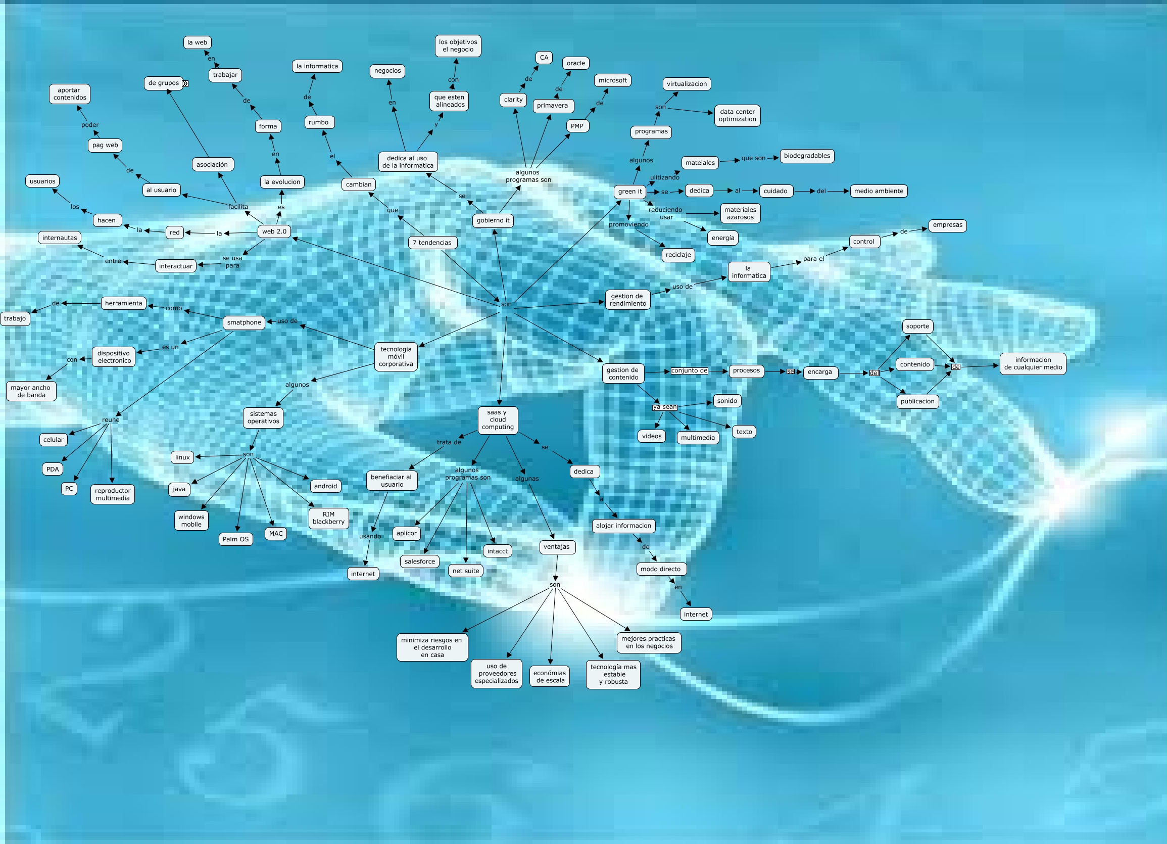 Este Cmap, tiene información relacionada con: tendencias, gobierno it algunos programas son PMP, gestion de contenido ya sean texto, saas y cloud computing algunos programas son aplicor, smatphone es un dispositivo electronico, la evolucion en forma, ventajas son económias de escala, rumbo de la informatica, gobierno it algunos programas son primavera, web 2.0 se usa para interactuar, web 2.0 facilita al usuario, PMP de microsoft, alojar informacion de modo directo, cuidado del medio ambiente, 7 tendencias son gobierno it, herramienta de trabajo, smatphone reune reproductor multimedia, 7 tendencias son gestion de rendimiento, 7 tendencias que cambian, sistemas operativos son Palm OS, saas y cloud computing algunos programas son salesforce