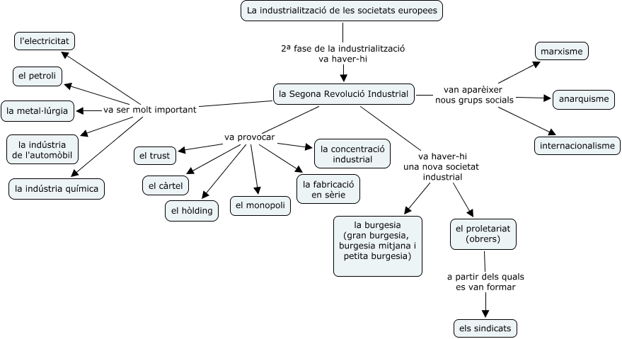la industrialització de les societats europees (2ª fase), la Segona Revolució Industrial van aparèixer nous grups socials anarquisme, la Segona Revolució Industrial va ser molt important la indústria química, la Segona Revolució Industrial van aparèixer nous grups socials marxisme, la Segona Revolució Industrial va provocar la concentració industrial, la Segona Revolució Industrial va ser molt important l'electricitat, La industrialització de les societats europees 2ª fase de la industrialització va haver-hi la Segona Revolució Industrial, la Segona Revolució Industrial va haver-hi una nova societat industrial el proletariat (obrers), la Segona Revolució Industrial va provocar el trust, el proletariat (obrers) a partir dels quals es van formar els sindicats, la Segona Revolució Industrial van aparèixer nous grups socials internacionalisme