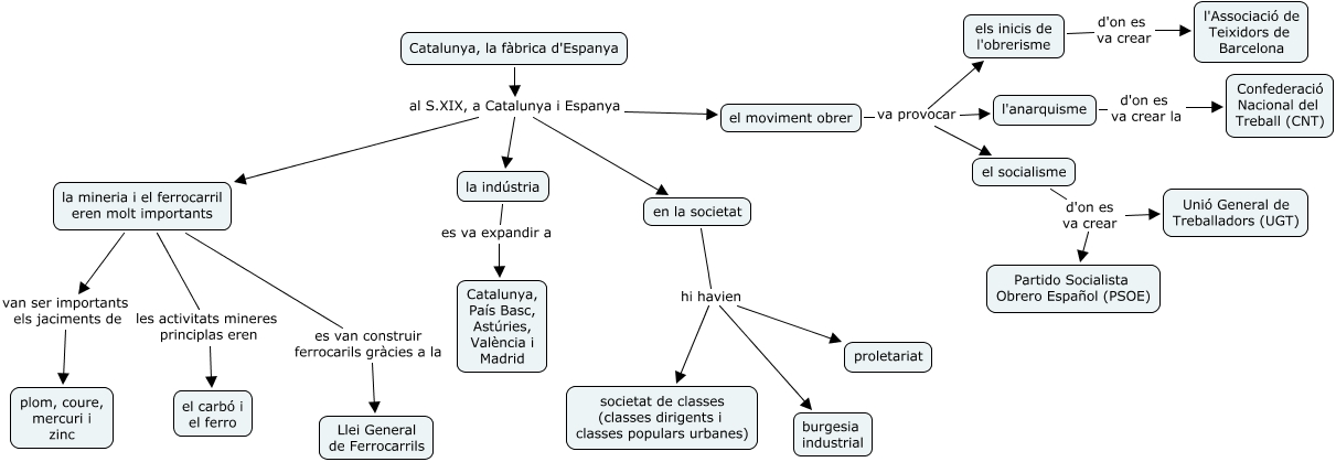 Catalunya, la fàbrica d'Espanya (2ª parte), la mineria i el ferrocarril eren molt importants les activitats mineres principlas eren el carbó i el ferro, la mineria i el ferrocarril eren molt importants es van construir ferrocarils gràcies a la Llei General de Ferrocarrils, el moviment obrer va provocar l'anarquisme, l'anarquisme d'on es va crear la Confederació Nacional del Treball (CNT), Catalunya, la fàbrica d'Espanya al S.XIX, a Catalunya i Espanya la indústria, la indústria es va expandir a Catalunya, País Basc, Astúries, València i Madrid, en la societat hi havien burgesia industrial, el socialisme d'on es va crear Unió General de Treballadors (UGT), la mineria i el ferrocarril eren molt importants van ser importants els jaciments de plom, coure, mercuri i zinc, Catalunya, la fàbrica d'Espanya al S.XIX, a Catalunya i Espanya el moviment obrer