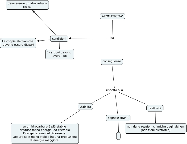 Questa Cmap, creata con IHMC CmapTools, contiene informazioni relative a: Aromaticità, AROMATICITA' ha conseguenze, conseguenze rispetto alla segnale HNMR, condizioni I carboni devono avere i px, conseguenze rispetto alla stabilità, condizioni deve essere un idrocarburo ciclico, reattività non da le reazioni chimiche degli alcheni (addizioni elettrofile), conseguenze rispetto alla reattività, AROMATICITA' ha condizioni, condizioni Le coppie elettroniche devono essere dispari, segnale HNMR, stabilità se un idrocarburo è più stabile produce meno energia, ad esempio l'idrogenazione del cicloesene. Oppure se è meno stabile ha una produzione di energia maggiore.