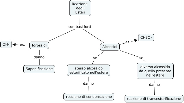 Questa Cmap, creata con IHMC CmapTools, contiene informazioni relative a: reazione degli esteri, diverso alcossido da quello presente nell'estere danno reazione di transesterificazione, Alcossidi se diverso alcossido da quello presente nell'estere, Reazione degli Esteri con basi forti Alcossidi, Alcossidi es. CH3O-, Reazione degli Esteri con basi forti Idrossidi, Idrossidi danno Saponificazione, Idrossidi es. OH-, Alcossidi se stesso alcossido esterificato nell'estere, stesso alcossido esterificato nell'estere danno reazione di condensazione