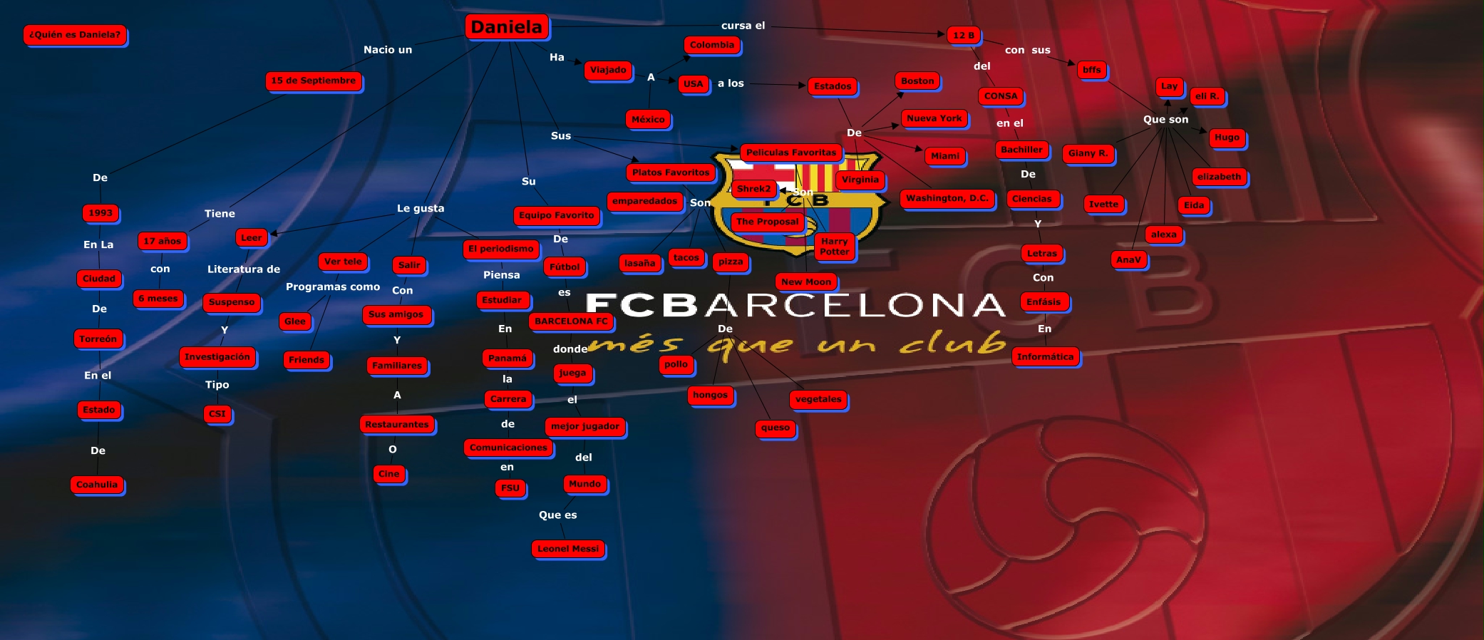 Este Cmap, tiene información relacionada con: DANIELA RODRÍGUEZ 12B, Viajado A USA, USA a los Estados, Daniela Ha Viajado, pizza De vegetales, Daniela Nacio un 15 de Septiembre, Daniela Sus Platos Favoritos, Estados De Miami, Platos Favoritos Son tacos, bffs Que son elizabeth, Estados De Boston, Estados De Washington, D.C., 17 años con 6 meses, CONSA en el Bachiller, Leer Literatura de Suspenso, Daniela Le gusta El periodismo, Mundo Que es Leonel Messi, Ver tele Programas como Glee, Platos Favoritos Son pizza, Restaurantes O Cine, Daniela Le gusta Salir