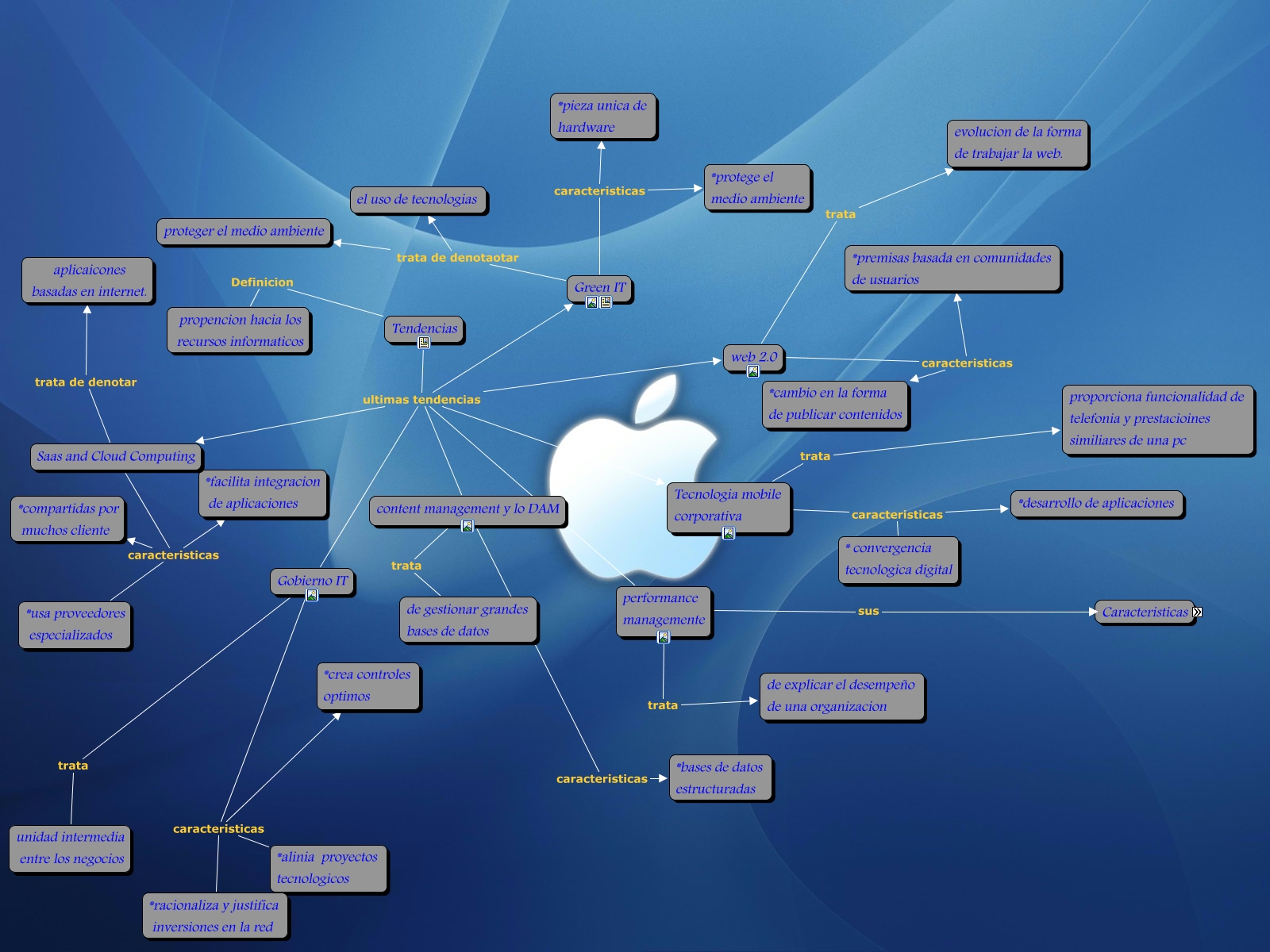 Este Cmap, tiene información relacionada con: Angel Henriquez, performance managemente sus *"hacer hablar" a los datos, Green IT trata de denotaotar proteger el medio ambiente, Gobierno IT caracteristicas *crea controles optimos, Tecnologia mobile corporativa caracteristicas *desarrollo de aplicaciones, Tendencias Definicion propencion hacia los recursos informaticos, performance managemente sus *apuntado a ventaja competitiva, Tendencias ultimas tendencias content management y lo DAM, Tendencias ultimas tendencias Gobierno IT, web 2.0 trata evolucion de la forma de trabajar la web., web 2.0 caracteristicas *premisas basada en comunidades de usuarios, performance managemente sus *posee herramientas de alta capacidad., Green IT caracteristicas *protege el medio ambiente, Gobierno IT trata unidad intermedia entre los negocios, Tecnologia mobile corporativa caracteristicas * convergencia tecnologica digital, Tendencias ultimas tendencias performance managemente, Tendencias ultimas tendencias Green IT, Gobierno IT caracteristicas *alinia proyectos tecnologicos, Tendencias ultimas tendencias Tecnologia mobile corporativa, Tecnologia mobile corporativa trata proporciona funcionalidad de telefonia y prestacioines similiares de una pc, Gobierno IT caracteristicas *racionaliza y justifica inversiones en la red
