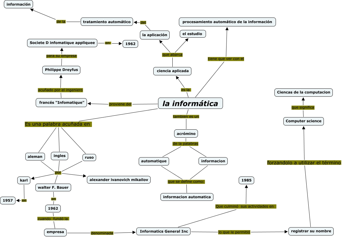 Este Cmap, tiene información relacionada con: Mapa de La Informatica, ingles por karl, la informática proviene del francés "Infomatique", Computer science que significa Ciencas de la computacion, registrar su nombre forzandolo a utilizar el término Computer science, la informática Es una palabra acuñada en ingles, empresa denominada Informatics General Inc, la informática tambien es un acrómino, Societe D infomatique appliquee en 1962, la informática es la ciencia aplicada, informacion que se define como: informacion automatica, acrómino de la palabras informacion, 1962 cuando fundó la empresa, la informática tiene que ver con el procesamiento automático de la información, ciencia aplicada que abarca el estudio, francés "Infomatique" acuñado por el ingeniero Philippe Dreyfus, ruso por karl, ciencia aplicada que abarca la aplicación, Informatics General Inc lo que le permitió registrar su nombre, acrómino de la palabras automatique, ruso por alexander ivanovich mikailov