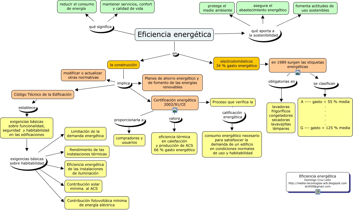 Este Cmap, tiene información relacionada con: Eficiencia energética, la construcción implica Planes de ahorro energético y de fomento de las energías renovables, Eficiencia energética en electrodomésticos 34 % gasto energético, la construcción implica modificar o actualizar otras normativas, Eficiencia energética qué significa reducir el consumo de energía, electrodomésticos 34 % gasto energético en 1989 surgen las etiquetas energéticas, Eficiencia energética en la construcción, exigencias básicas sobre funcionalidad, seguridad y habitabilidad en las edificaciones exigencias básicas sobre habitabilidad Rendimiento de las instalaciones térmicas, Eficiencia energética qué aporta a la sostenibilidad protege el medio ambiente, exigencias básicas sobre funcionalidad, seguridad y habitabilidad en las edificaciones exigencias básicas sobre habitabilidad Eficiencia energética de las instalaciones de iluminación, la construcción implica Código Técnico de la Edificación, Eficiencia energética qué aporta a la sostenibilidad fomenta actitudes de uso sostenibles, Código Técnico de la Edificación establece exigencias básicas sobre funcionalidad, seguridad y habitabilidad en las edificaciones, Proceso que verifica la calificación energética consumo energético necesario para satisfaxcer la demanda de un edificio en condiciones normales de uso y habitabilidad, Certificación energética 2002/91/CE valora eficiencia térmica en calefacción y producción de ACS 66 % gasto energético, en 1989 surgen las etiquetas energéticas obligatorias en lavadoras frigoríficos congeladores secadoras lavavajillas lámparas, Certificación energética 2002/91/CE Proceso que verifica la, exigencias básicas sobre funcionalidad, seguridad y habitabilidad en las edificaciones exigencias básicas sobre habitabilidad Contribución solar mínima al ACS, Eficiencia energética qué aporta a la sostenibilidad asegura el abastecimiento energético, la construcción implica Certificación energética 2002/91/CE, en 1989 surgen las etiquetas energéticas se clasifican A ---- gasto < 55 % media . . . . . G --- gasto > 125 % media