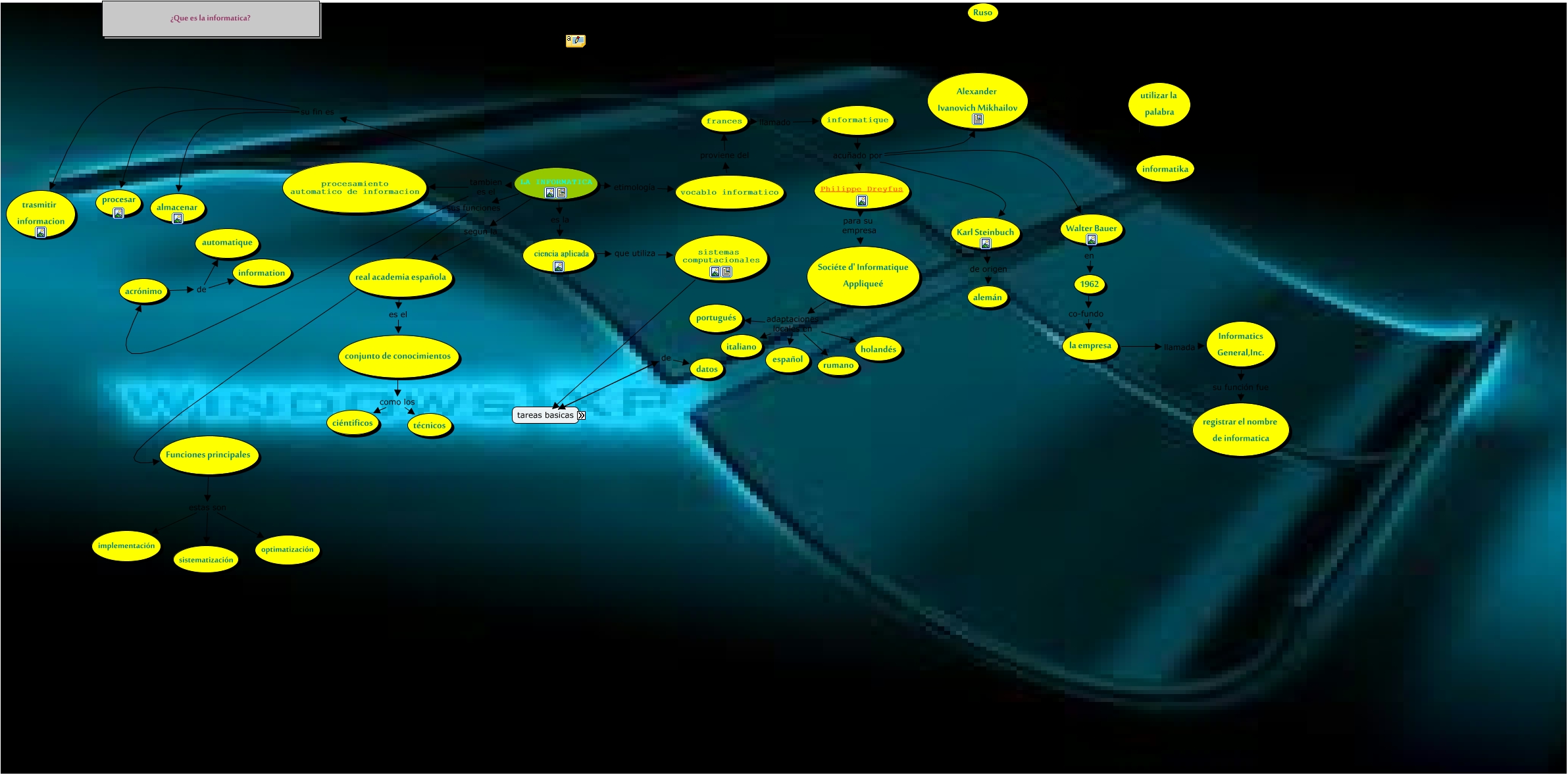 Este Cmap, tiene información relacionada con: LA INFORMATRICA, Funciones principales estas son sistematización, LA INFORMATICA su fin es procesar, conjunto de conocimientos como los ciéntificos, acrónimo de automatique, LA INFORMATICA su fin es almacenar, Salida de informacion, informatique acuñado por Walter Bauer, Sociéte d' Informatique Appliqueé adaptaciones locales en rumano, sistemas computacionales para realiza tareas: Salida, Sociéte d' Informatique Appliqueé adaptaciones locales en portugués, acrónimo de information, Salida se encarga de trasmision de resultados, LA INFORMATICA es la ciencia aplicada, utilizar la palabra informatika, sistemas computacionales para realiza tareas: Proceso, tratamiento de informacion, Proceso se encarga del tratamiento, sistemas computacionales para realiza tareas: Entrada, la empresa llamada Informatics General,Inc., Salida de datos