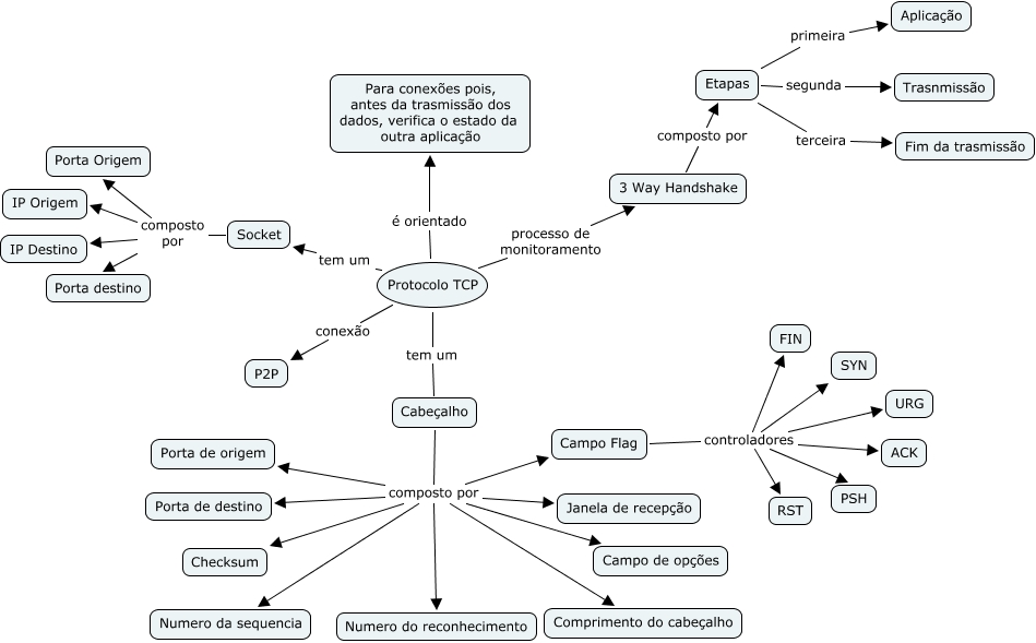 Esse mapa conceitual, produzido no IHMC CmapTools, tem a informação relacionada a: ProtocoloTCP, Cabeçalho composto por Comprimento do cabeçalho, Cabeçalho composto por Janela de recepção, Etapas segunda Trasnmissão, Socket composto por IP Destino, Campo Flag controladores SYN, Protocolo TCP é orientado Para conexões pois, antes da trasmissão dos dados, verifica o estado da outra aplicação, Cabeçalho composto por Numero da sequencia, Socket composto por IP Origem, Cabeçalho composto por Porta de destino, Cabeçalho composto por Porta de origem, Cabeçalho composto por Numero do reconhecimento, Campo Flag controladores URG, Etapas terceira Fim da trasmissão, Cabeçalho composto por Campo de opções, Protocolo TCP tem um Cabeçalho, Cabeçalho composto por Campo Flag, Campo Flag controladores ACK, Etapas primeira Aplicação, Protocolo TCP tem um Socket, Cabeçalho composto por Checksum