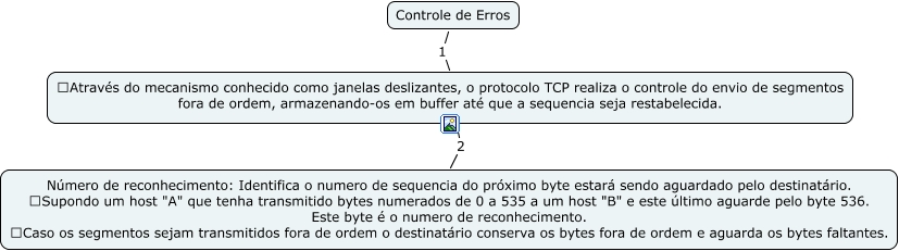 Esse mapa conceitual, produzido no IHMC CmapTools, tem a informação relacionada a: Controle de Erros, Controle de Erros 1 Através do mecanismo conhecido como janelas deslizantes, o protocolo TCP realiza o controle do envio de segmentos fora de ordem, armazenando-os em buffer até que a sequencia seja restabelecida., Através do mecanismo conhecido como janelas deslizantes, o protocolo TCP realiza o controle do envio de segmentos fora de ordem, armazenando-os em buffer até que a sequencia seja restabelecida. 2 Número de reconhecimento: Identifica o numero de sequencia do próximo byte estará sendo aguardado pelo destinatário. Supondo um host "A" que tenha transmitido bytes numerados de 0 a 535 a um host "B" e este último aguarde pelo byte 536. Este byte é o numero de reconhecimento. Caso os segmentos sejam transmitidos fora de ordem o destinatário conserva os bytes fora de ordem e aguarda os bytes faltantes.