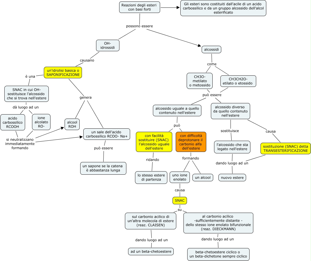 Questa Cmap, creata con IHMC CmapTools, contiene informazioni relative a: esteri basi forti _alessia, con difficoltà deprotonare il carbonio alfa dell'estere formando uno ione enolato, l'alcossido che sta legato nell'estere dando luogo ad un nuovo estere, CH3CH2O- etilato o etossido può essere alcossido uguale a quello contenuto nell'estere, un sale dell'acido carbossilico RCOO- Na+ può essere un sapone se la catena è abbastanza lunga, uno ione enolato causa SNAC, alcossido uguale a quello contenuto nell'estere può con difficoltà deprotonare il carbonio alfa dell'estere, SNAC su al carbonio acilico -sufficientemente distante - dello stesso ione enolato bifunzionale (reaz. DIECKMANN), CH3CH2O- etilato o etossido può essere alcossido diverso da quello contenuto nell'estere, con difficoltà deprotonare il carbonio alfa dell'estere formando un alcool, ione alcolato RO- si neutralizzano immediatamente formando un sale dell'acido carbossilico RCOO- Na+, Reazioni degli esteri con basi forti Gli esteri sono costituiti dall'acile di un acido carbossilico e da un gruppo alcossido dell'alcol esterificato, un'idrolisi basica o SAPONIFICAZIONE genera alcool ROH, con facilità sostituire (SNAC) l'alcossido uguale dell'estere ridando lo stesso estere di partenza, SNAC in cui OH- sostituisce l'alcossido che si trova nell'estere dà luogo ad un acido carbossilico RCOOH, ione alcolato RO- si neutralizzano immediatamente formando alcool ROH, alcossidi come CH3O- metilato o metossido, acido carbossilico RCOOH si neutralizzano immediatamente formando alcool ROH, CH3O- metilato o metossido può essere alcossido diverso da quello contenuto nell'estere, alcossido uguale a quello contenuto nell'estere può con facilità sostituire (SNAC) l'alcossido uguale dell'estere, Reazioni degli esteri con basi forti possono essere OH- idrossidi