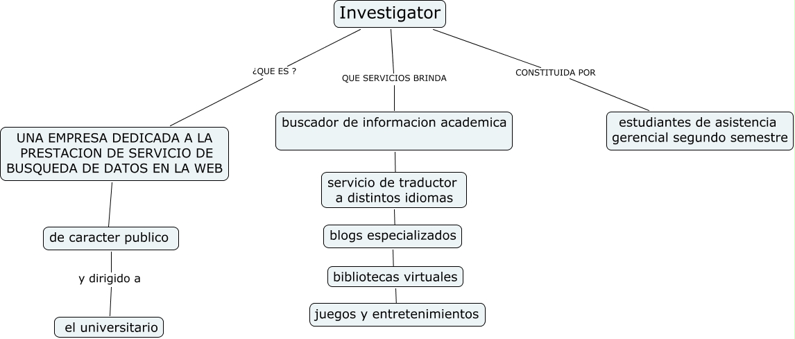Este Cmap, tiene información relacionada con: INVESTIGATOR, servicio de traductor a distintos idiomas ???? blogs especializados, blogs especializados ???? bibliotecas virtuales, buscador de informacion academica ???? servicio de traductor a distintos idiomas, UNA EMPRESA DEDICADA A LA PRESTACION DE SERVICIO DE BUSQUEDA DE DATOS EN LA WEB ???? de caracter publico, de caracter publico y dirigido a el universitario, bibliotecas virtuales ???? juegos y entretenimientos, Investigator CONSTITUIDA POR estudiantes de asistencia gerencial segundo semestre, Investigator QUE SERVICIOS BRINDA buscador de informacion academica, Investigator ¿QUE ES ? UNA EMPRESA DEDICADA A LA PRESTACION DE SERVICIO DE BUSQUEDA DE DATOS EN LA WEB