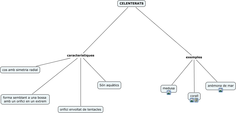 Aquest mapa conceptual conté informació relacionada amb: 11-Cmap celenterats, CELENTERATS exemples anèmona de mar, CELENTERATS característiques Són aquàtics, CELENTERATS exemples corall, CELENTERATS característiques orifici envoltat de tentacles, CELENTERATS característiques cos amb simetria radial, CELENTERATS exemples medusa, CELENTERATS característiques forma semblant a una bossa amb un orifici en un extrem